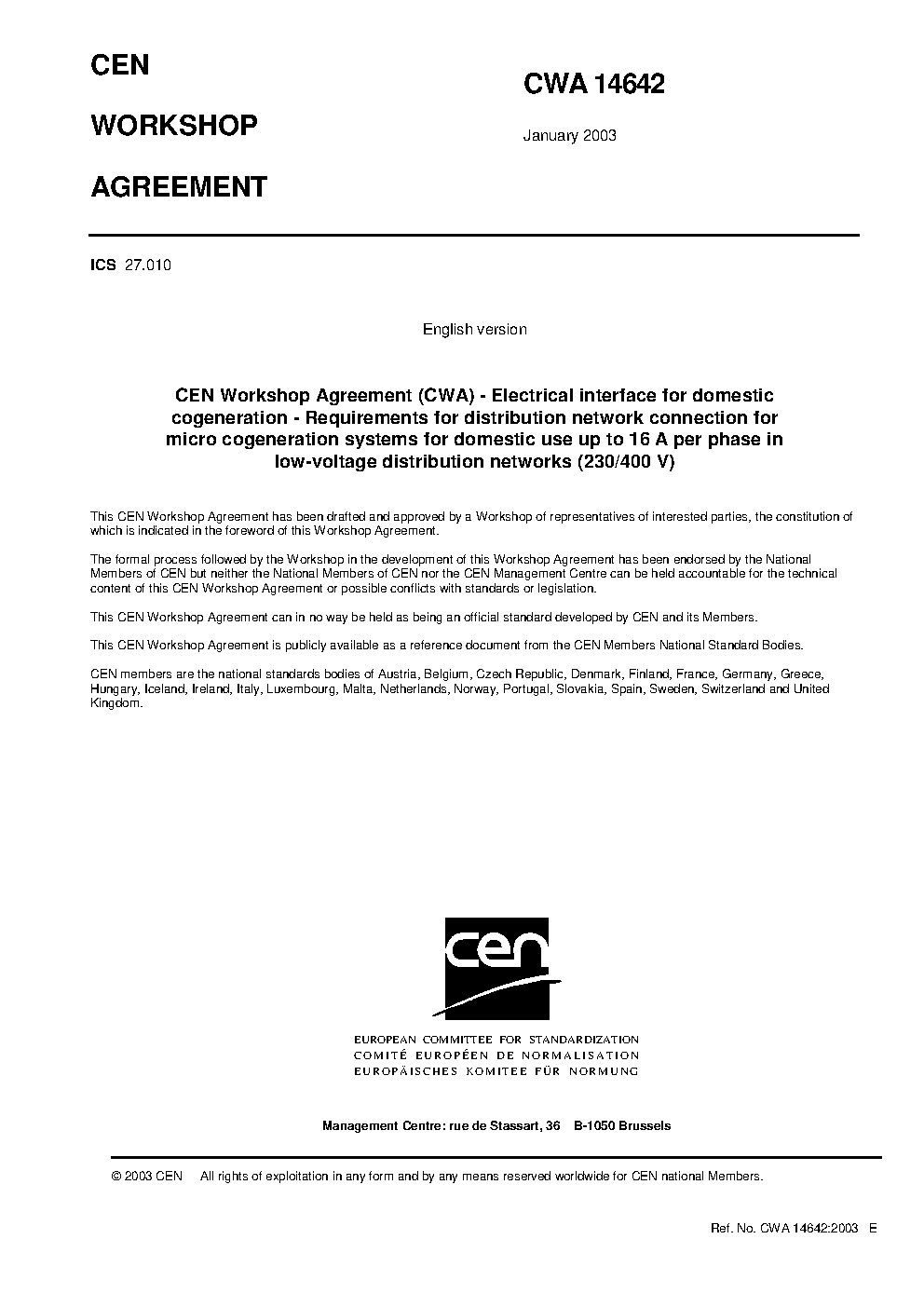CEN Workshop Agreement (CWA) - Electrical interface for domestic cogeneration - Requirements for distribution network connection for micro cogeneration systems for domestic use up to 16 A per phase in low-voltage distribution networks (230/400 V)