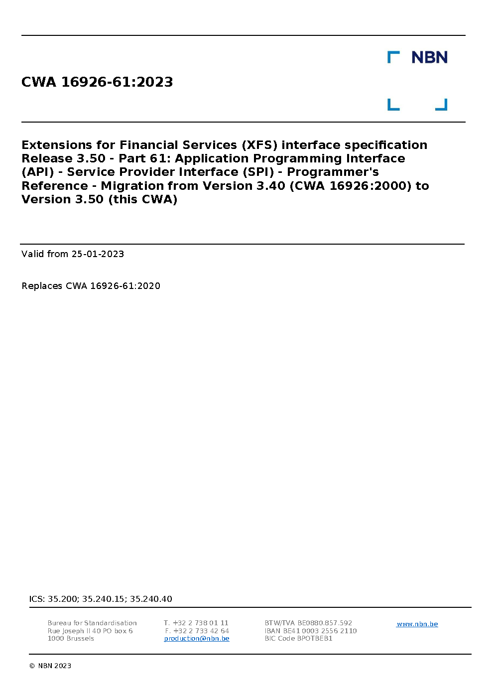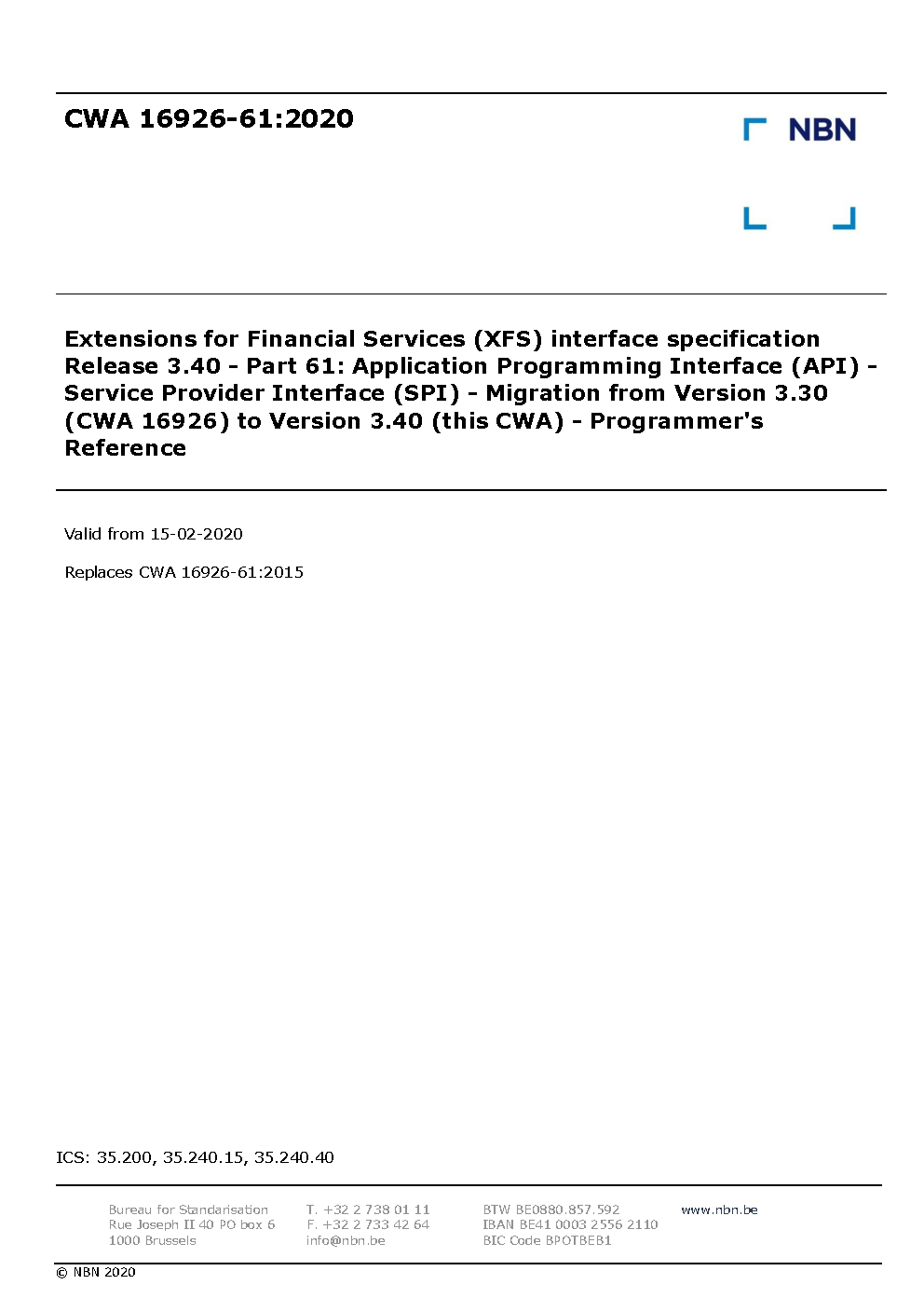 Extensions for Financial Services (XFS) interface specification Release 3.50 - Part 61: Application Programming Interface (API) - Service Provider Interface (SPI) - Programmer's Reference - Migration from Version 3.40 (CWA 16926:2000) to Version 3.50 (this CWA)