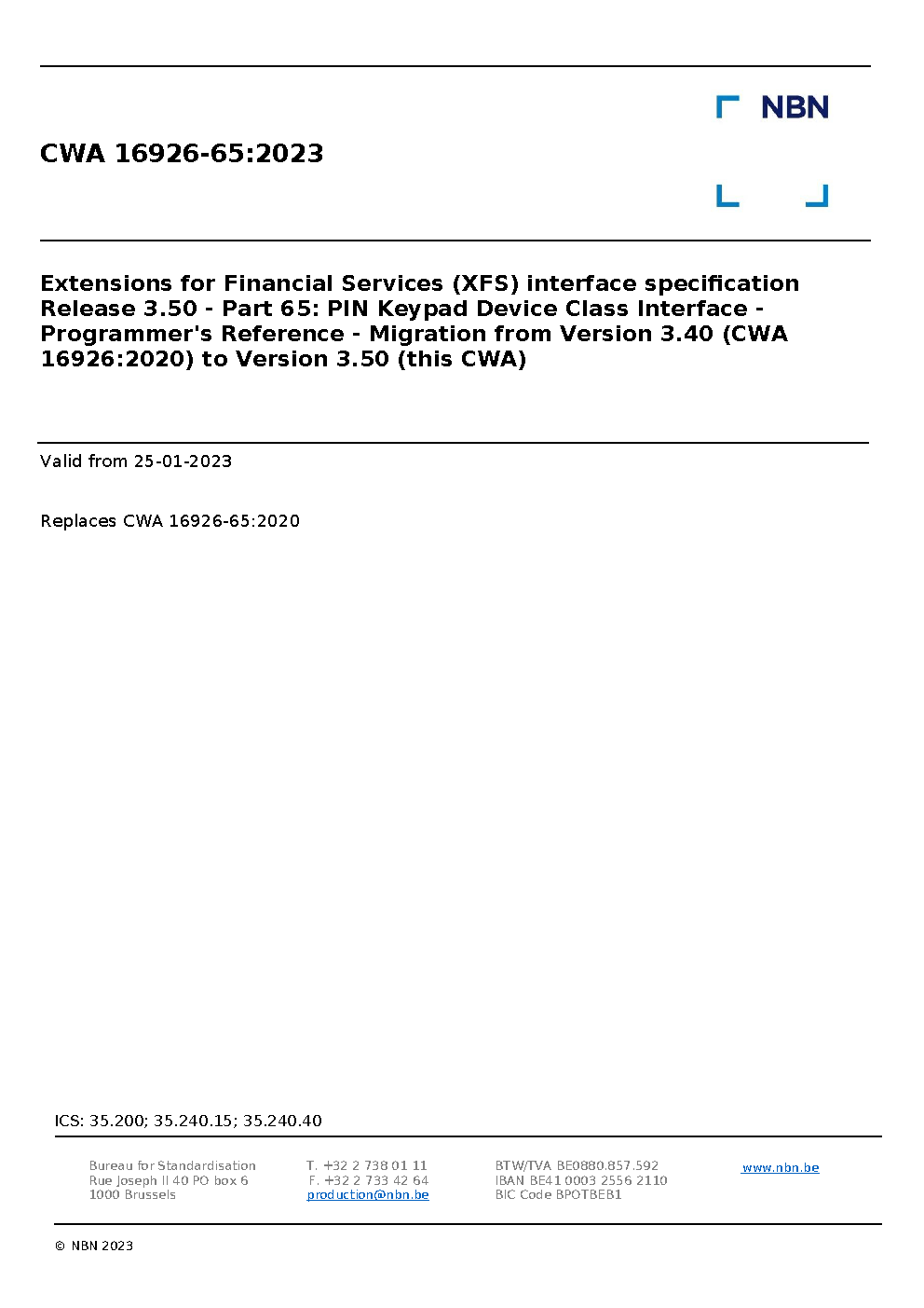 Extensions for Financial Services (XFS) interface specification - Release 3.40 - Part 65: PIN Device Class Interface - Migration from version 3.30 (CWA 16926) to Version 3.40 (this CWA) - Programmer's Reference