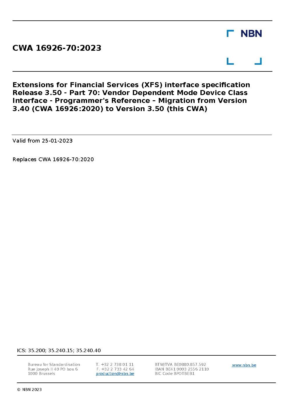 Extensions for Financial Services (XFS) interface specification Release 3.50 - Part 70: Vendor Dependent Mode Device Class Interface - Programmer's Reference – Migration from Version 3.40 (CWA 16926:2020) to Version 3.50 (this CWA)
