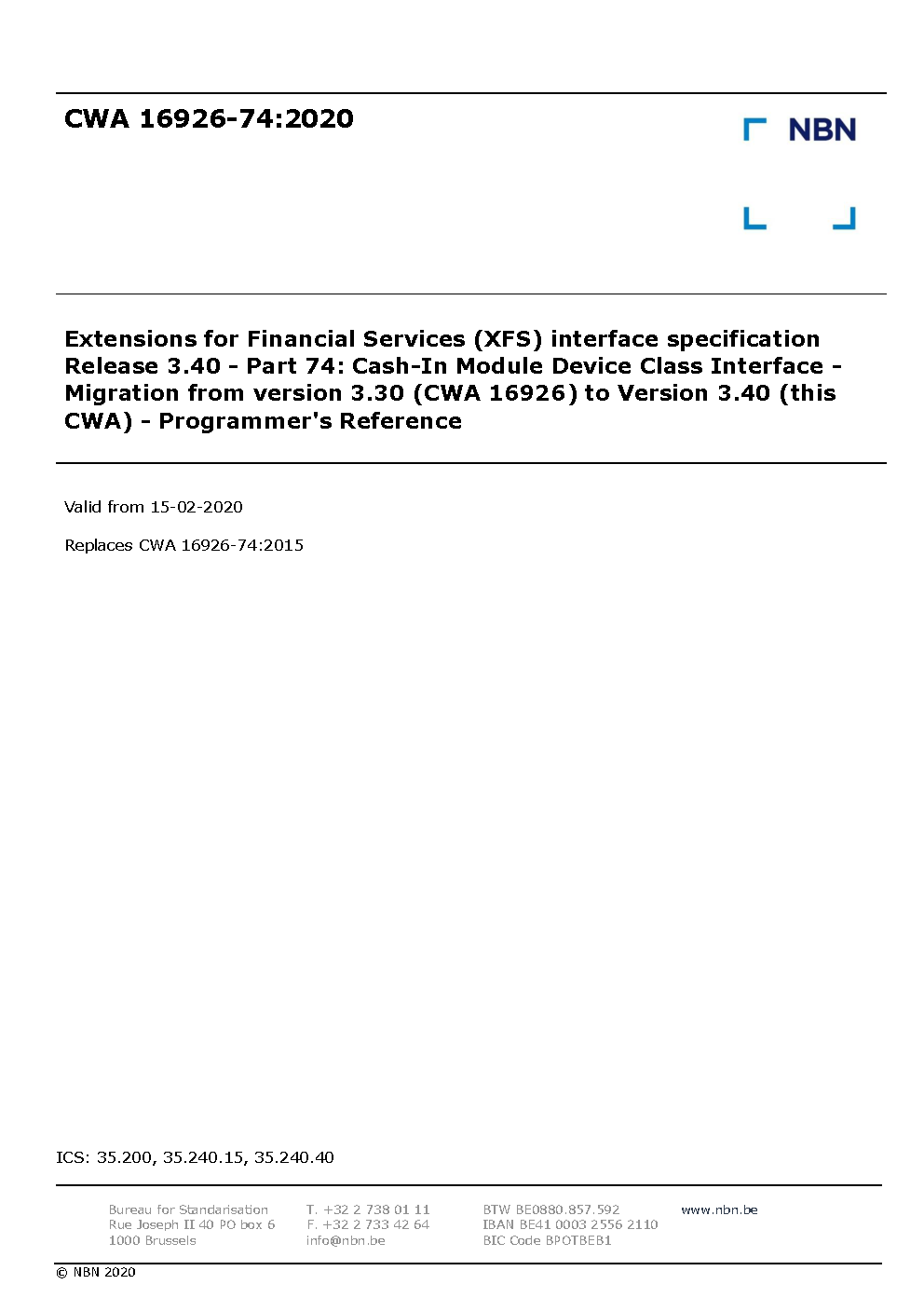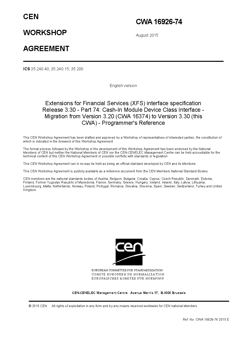 Extensions for Financial Services (XFS) interface specification Release 3.40 - Part 74: Cash-In Module Device Class Interface - Migration from version 3.30 (CWA 16926) to Version 3.40 (this CWA) - Programmer's Reference