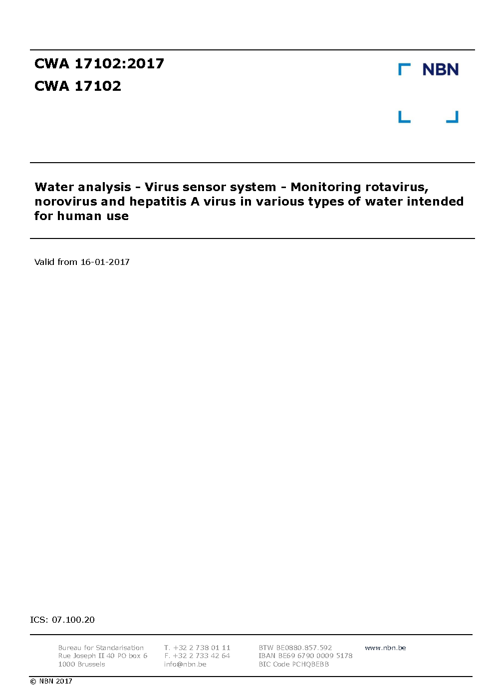 This CEN Workshop Agreement “Water analysis — Virus sensor system — Monitoring rotavirus, norovirus and hepatitis A virus in various types of water intended for human use” defines a sensor system which is intended to provide a rapid, simple and economic method for monitoring dangerous levels of hepatitis A virus, norovirus and rotavirus in various types of water intended for human use via consumption, recreation or food production.