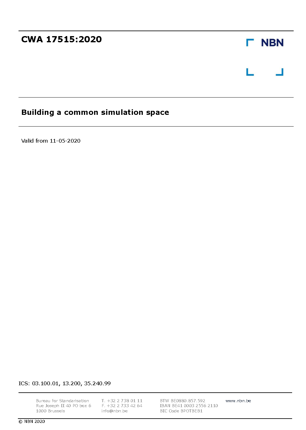 The aim for this CEN Workshop Agreement (CWA) is to provide a solid foundation of architectural guidelines to be used for jointly configuring a common simulation space. This CWA does not have the aim to closely integrate connected applications together. The general vision is that simulators are created for one or more specific domain knowledge areas with their own granularity, boundaries and purposes. To closely integrate these simulators would mean to integrate these domains as well, most likely causing irredeemable conflicts in the individual granularities, boundaries and purposes. In order to maintain individuality of the simulators, a common simulation space is providing a framework for communication, based on a minimum commonality of the data accepted and produced by the individual simulators and an event-driven design philosophy.