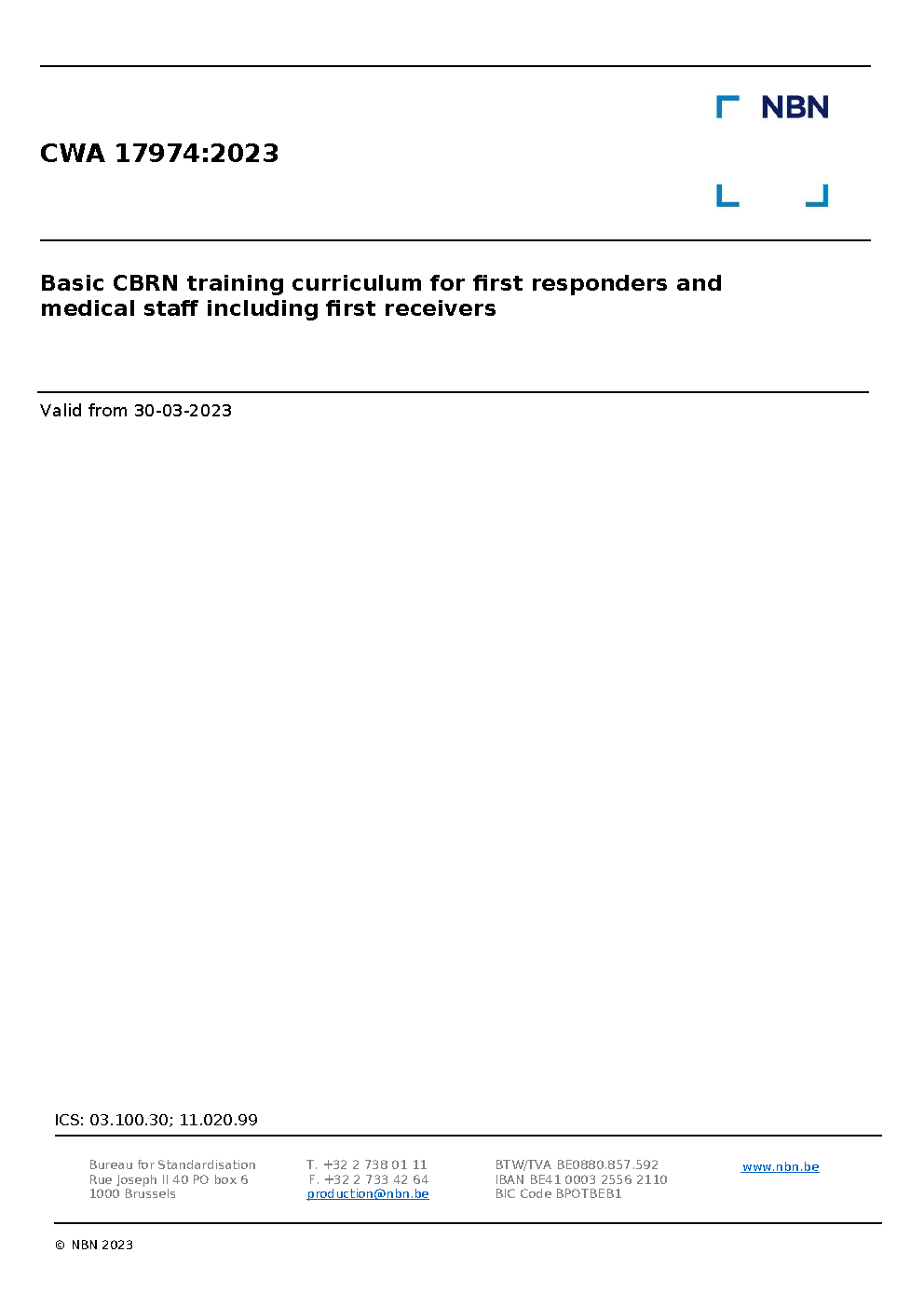 This CEN workshop agreement defines a harmonized CBRN training curriculum to be used and valued by training institutes for first responders in Europe. It considers practitioner’s needs and possess a modular structure that enables national organizations to build upon based on their own examples, procedures and experiences.