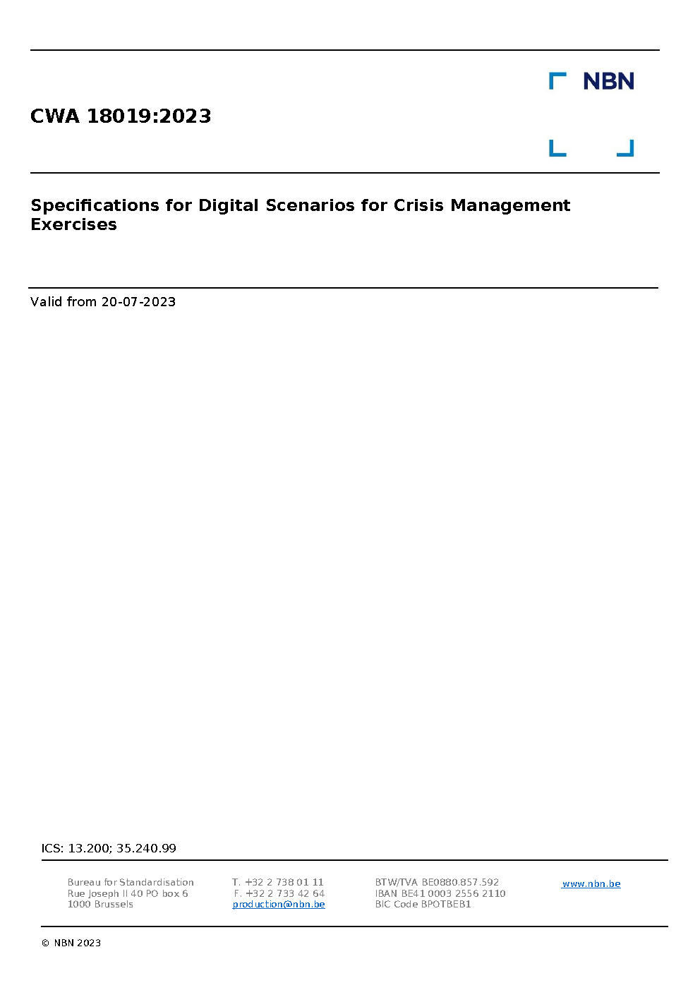 This document specifies a digital process for the planning of crisis management exercises. The CWA will provide recommendations on the type of digital information exchanged for scenarios in crisis management and the use of a data model for exchanging scenario characteristics. It also provides recommendations for the implementation of the data model to scenario building tools. This document is applicable to organizations responsible for planning and implementation of exercises and to technology providers focusing on the development of scenario building tools for crisis management activities.