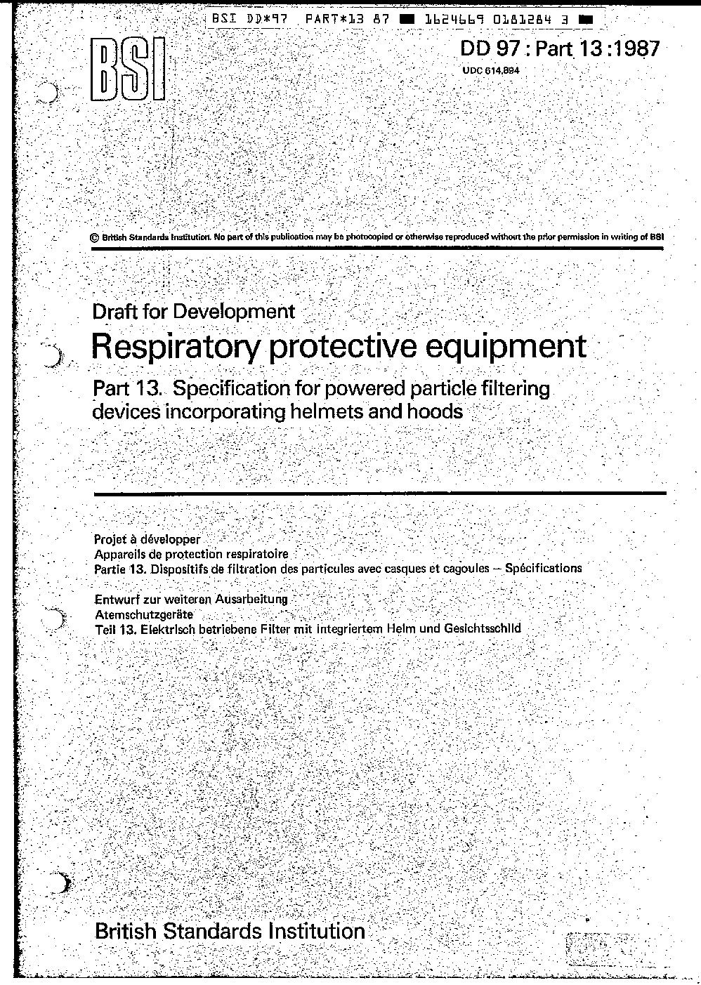 Respiratory protective equipment Specification for powered particle filtering devices incorporating helmets and hoods