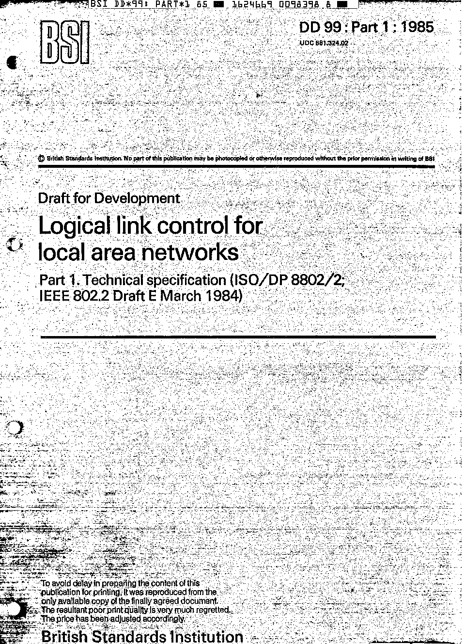 Logical link control for local area networks Technical specification (ISO/DP 8802/2; IEEE 802.2 Draft E March 1984)