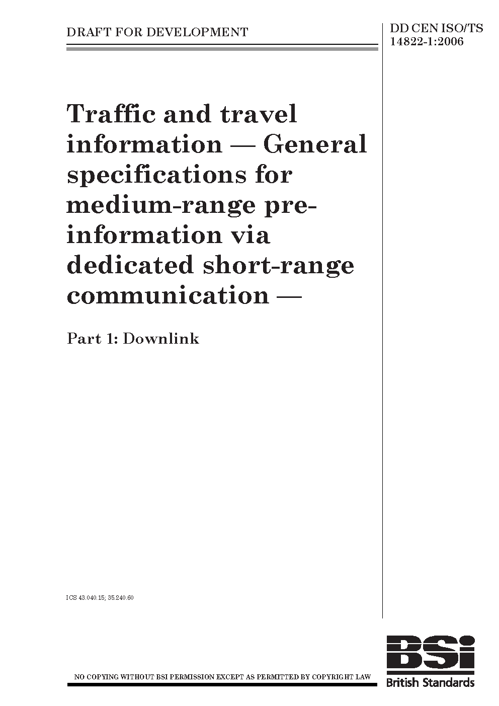 Traffic and travel information. General specifications for medium-range pre-information via dedicated short-range communication Downlink