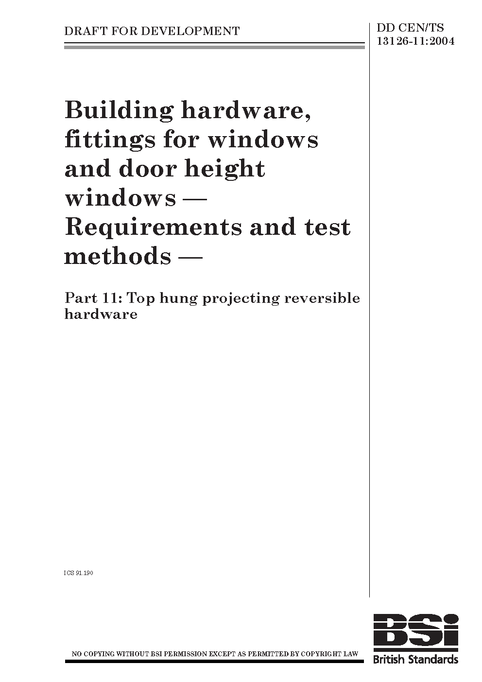 Building hardware, fittings for windows and door height windows. Requirements test methods Top hung projecting reversible hardware