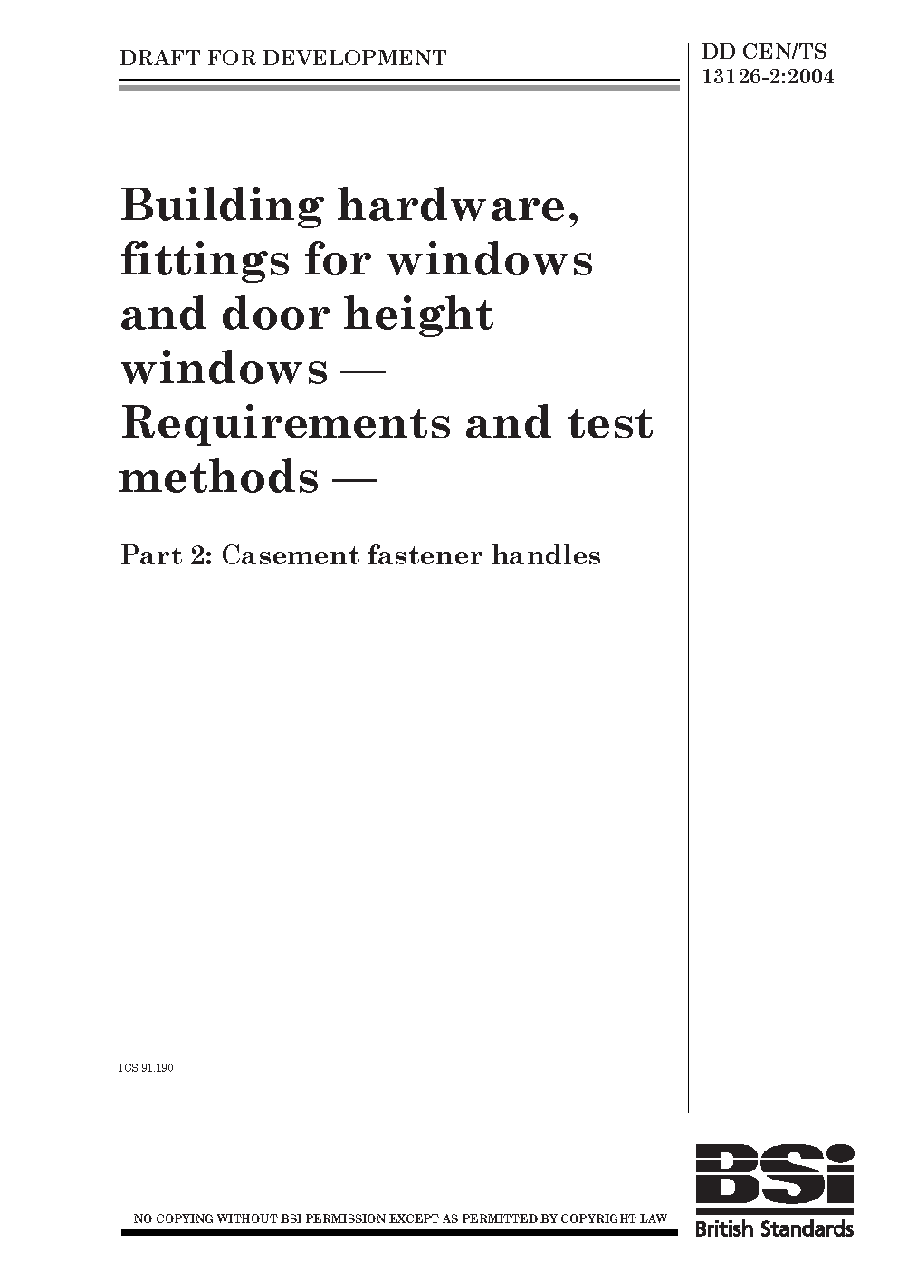 Building hardware, fittings for windows and door height windows. Requirements test methods Casement fastener handles