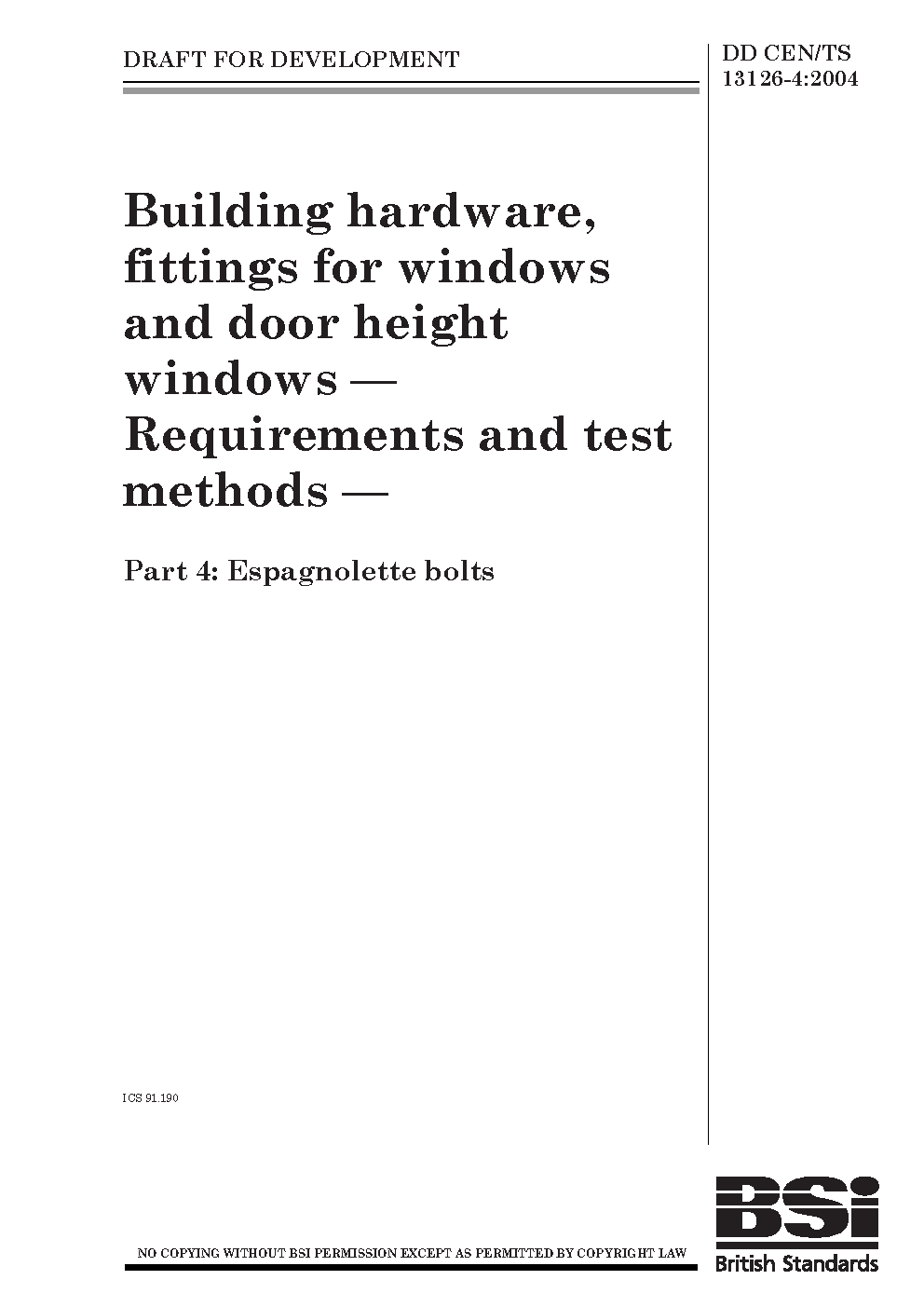 Building hardware, fittings for windows and door height windows. Requirements test methods Espagnolette bolts