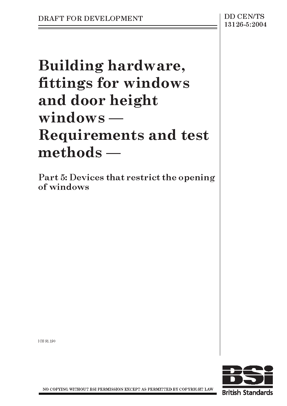 Building hardware, fittings for windows and door height windows. Requirements test methods Devices that restrict the opening of
