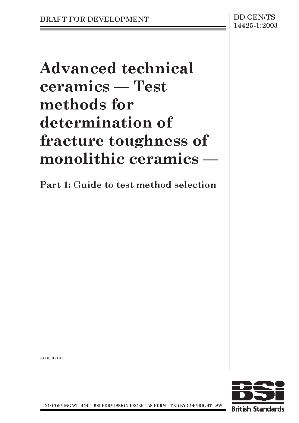 Advanced technical ceramics. Test methods for determination of fracture toughness monolithic ceramics Guide to test method selection