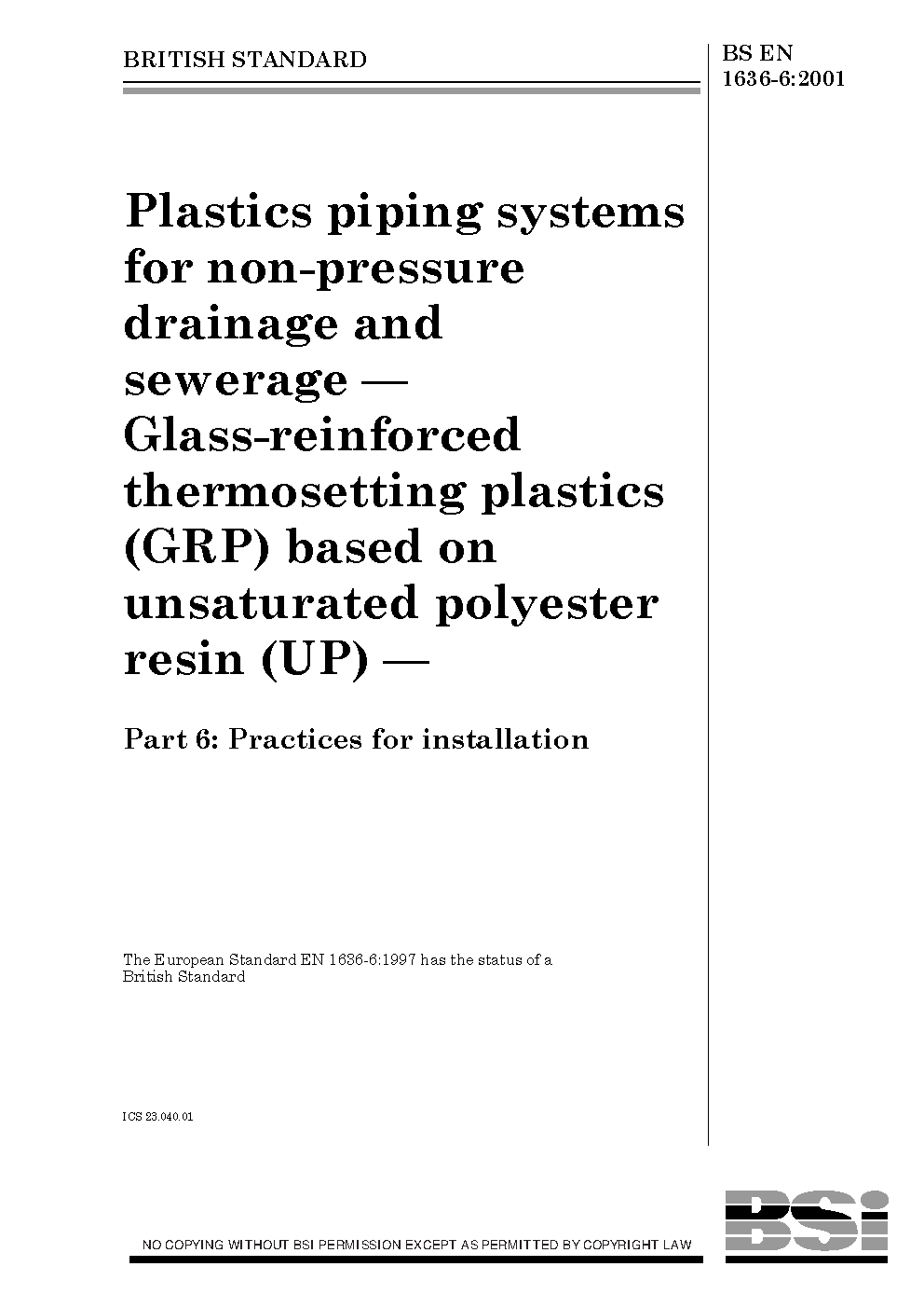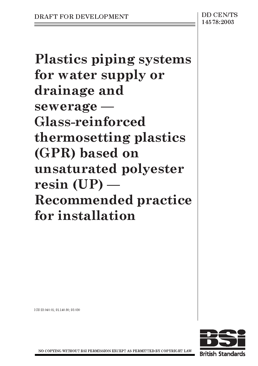 Plastics piping systems for water supply or drainage and sewerage. Glass-reinforced thermosetting plastics (GPR) based on unsaturated polyester resin (UP). Recommended practice for installation