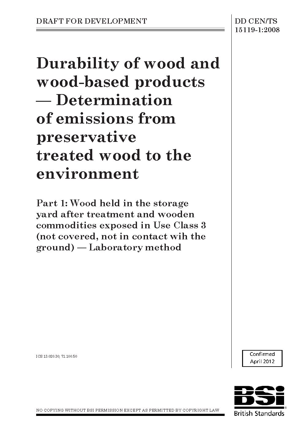 Durability of wood and wood-based products. Determination emissions from preservative treated to the environment Wood held in storage yard after treatment wooden commodities exposed Use Class 3 (not covered, not contact with ground). Laboratory method