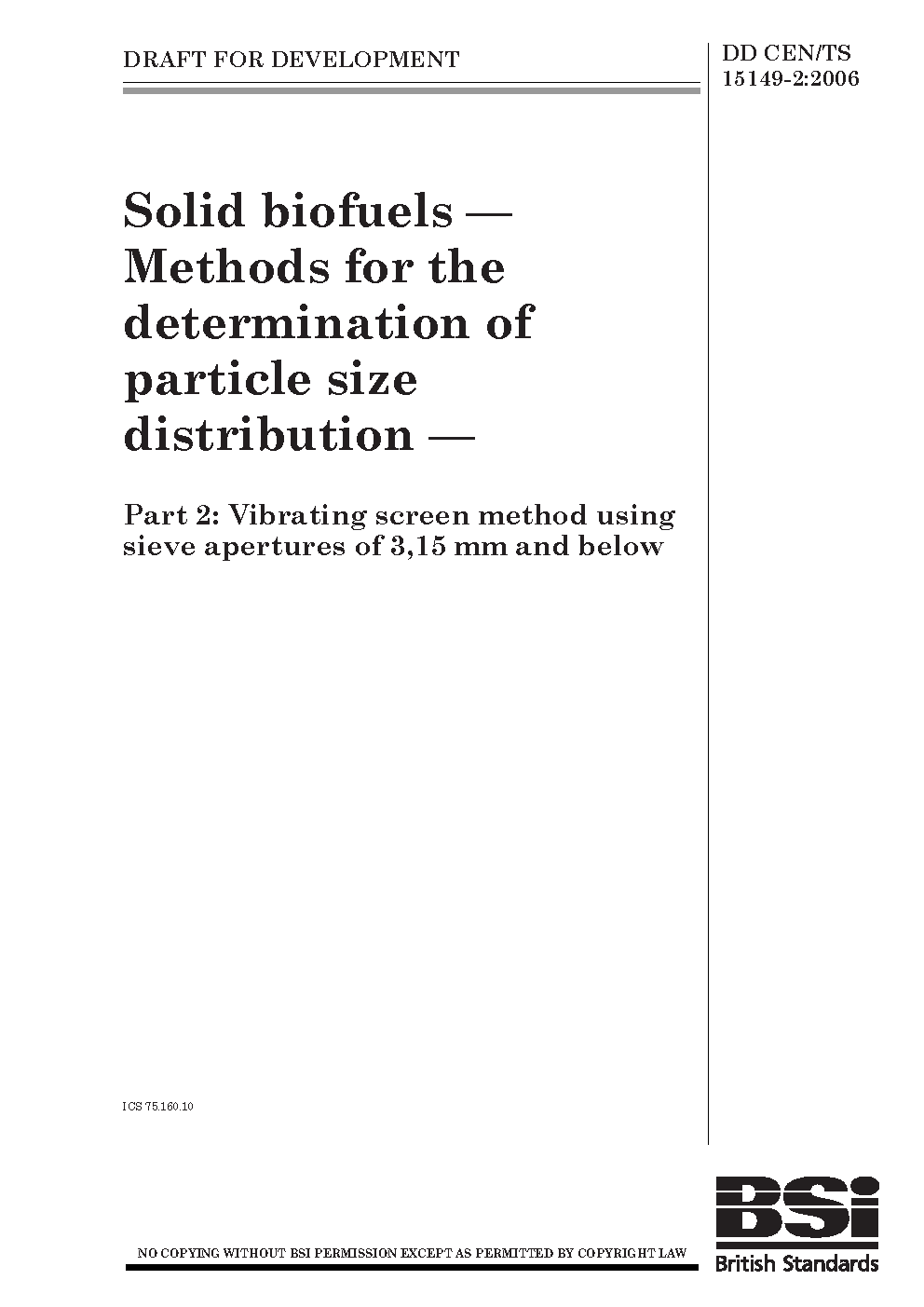 Solid biofuels. Methods for the determination of particle size distribution Vibrating screen method using sieve apertures 3,15 mm and below