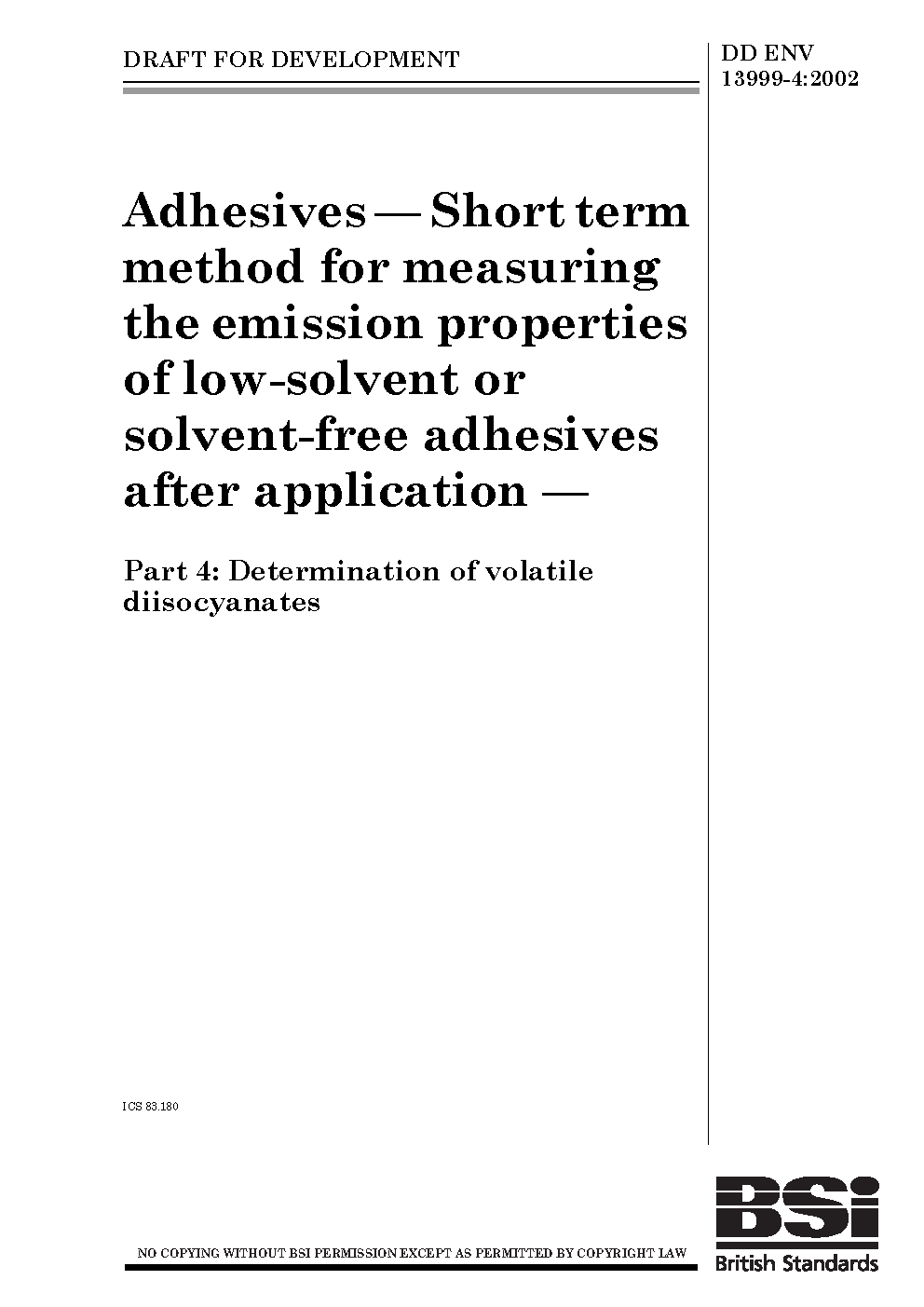Adhesives. Short term method for measuring the emission properties of low-solvent or solvent-free adhesives after application Determination volatile diisocyanates