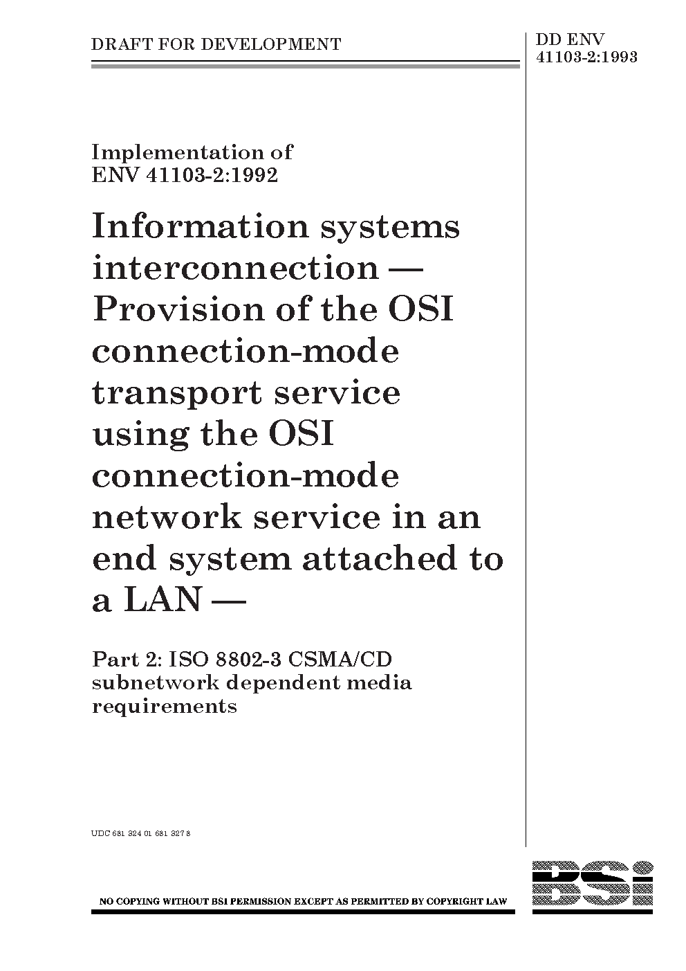 Information systems inter-connection. Provision of the OSI connection-mode transport service using network in an end system attached to a LAN ISO 8802-3 CSMA/CD subnetwork dependent media requirements