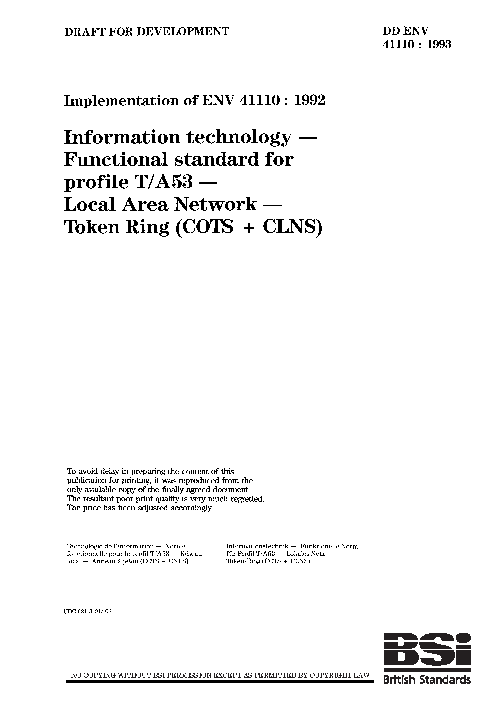 Information technology. Functional standard for profile T/A53. Local Area Network. Token Ring (COTS + CLNS)