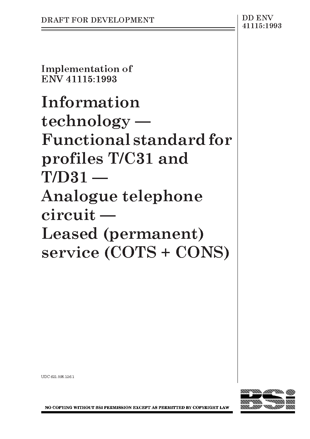 Information technology. Functional standard for profiles T/C31 and T/D31. Analogue telephone circuit. Leased (permanent) service (COTS + CONS)