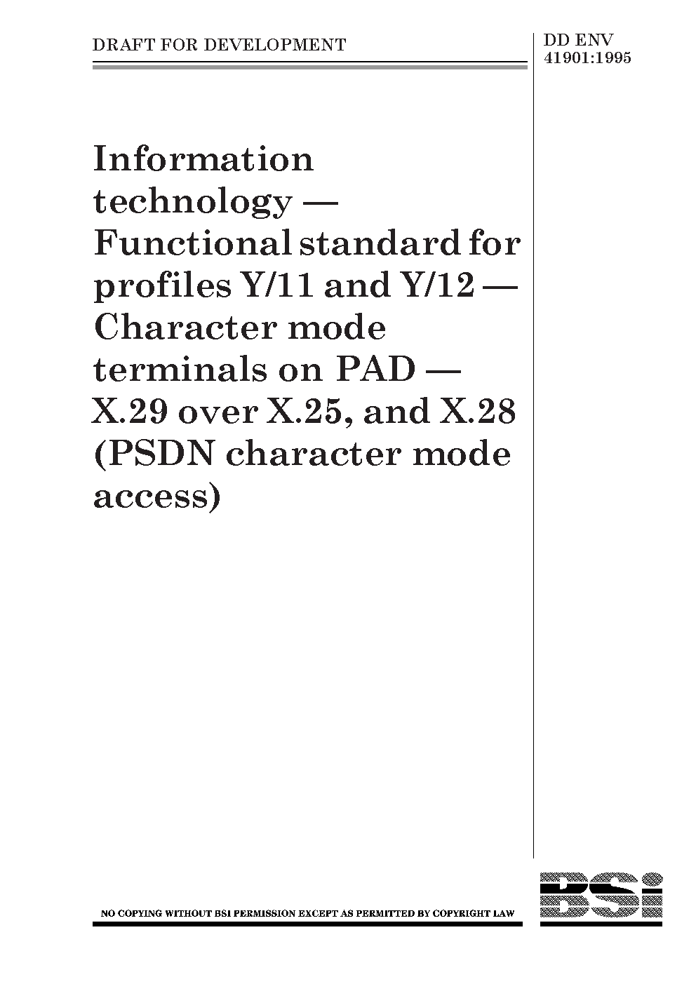 Information technology. Functional standard for profiles Y/11 and Y/12. Character mode terminals on PAD. X.29 over X.25, and X.28 (PSDN character mode access)