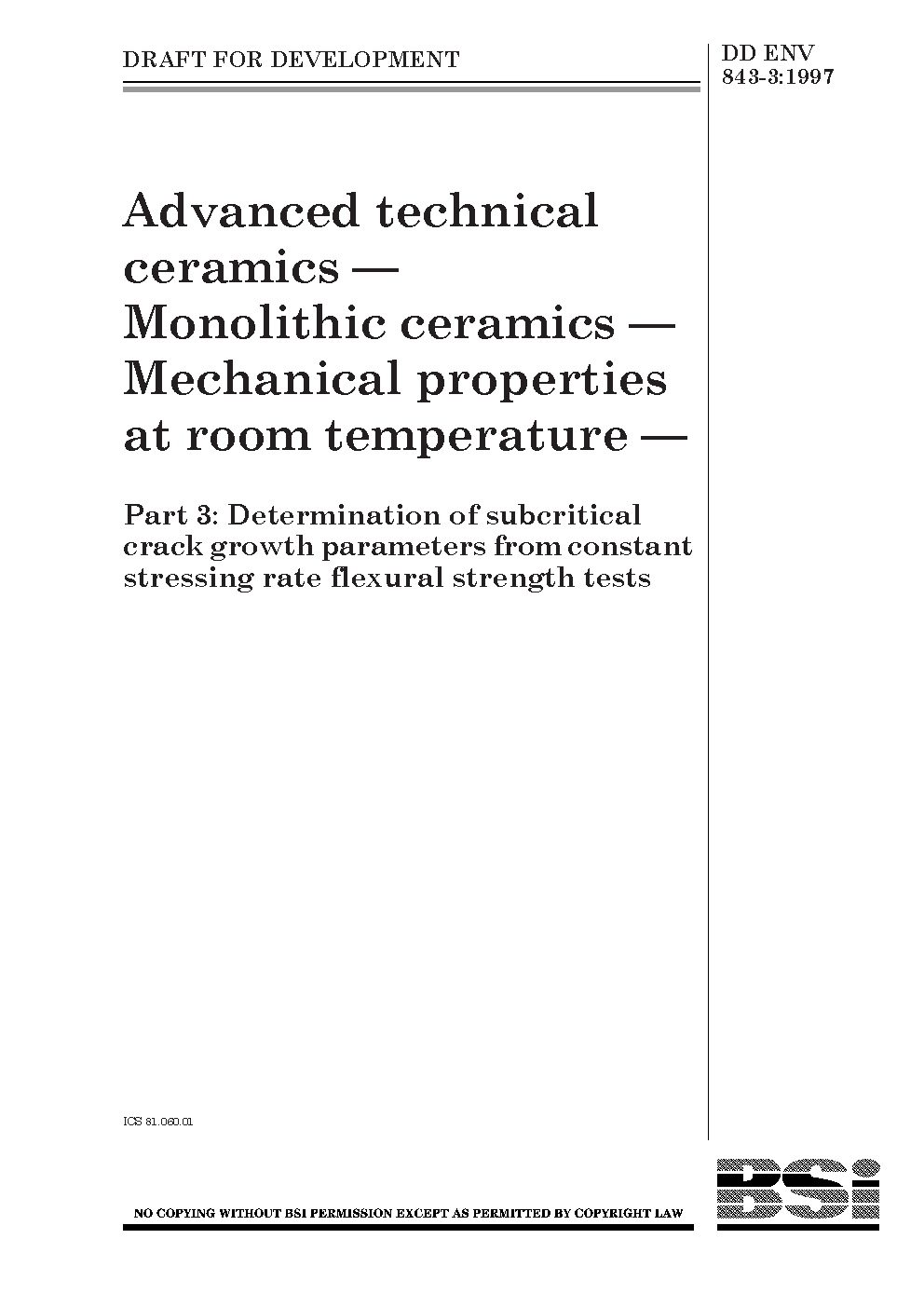 Advanced technical ceramics. Monolithic Mechanical properties at room temperature Determination of subcritical crack growth parameters from constant stressing rate flexural strength tests