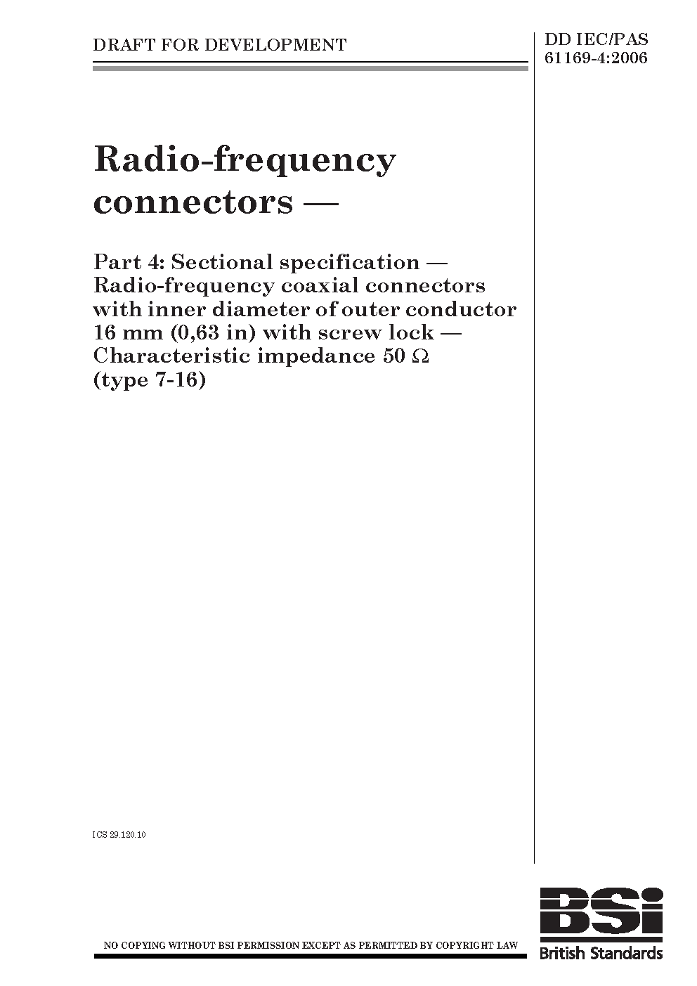 Radio-frequency connectors Sectional specification. coaxial with inner diameter of outer conductor 16 mm (0,63 in) screw lock. Characteristic impedance 50 O (type 7-16)
