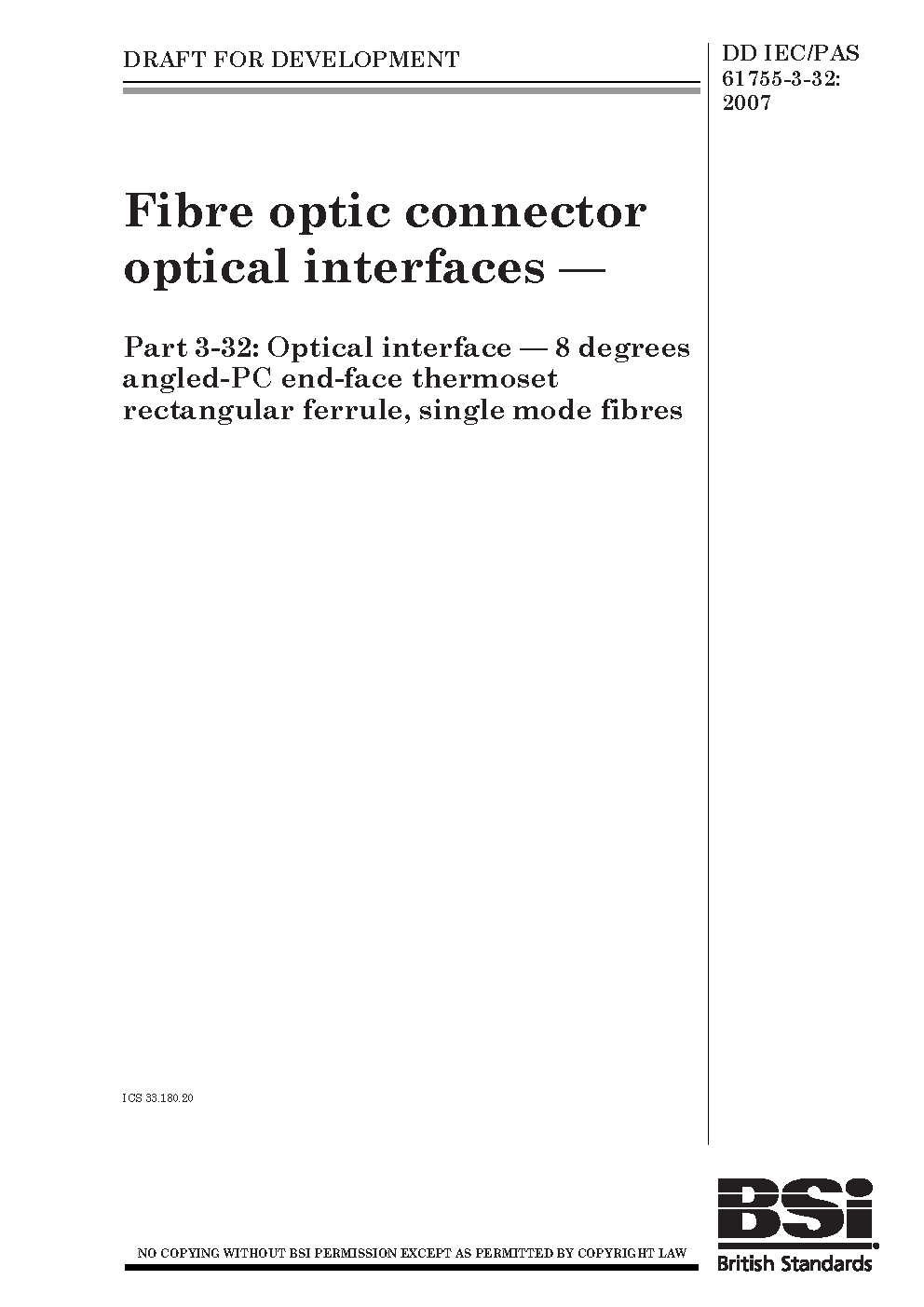 Fibre optic connector optical interfaces Optical interface. 8 degrees angled-PC end-face thermoset rectangular ferrule, single mode fibres