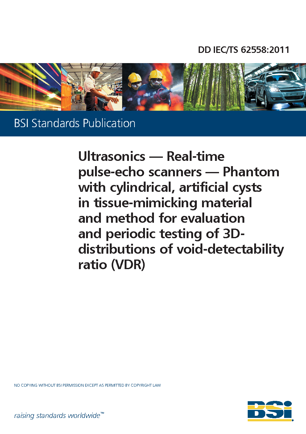 Ultrasonics. Real-time pulse-echo scanners. Phantom with cylindrical, artificial cysts in tissue-mimicking material and method for evaluation and periodic testing of 3D-distributions of void-detectability ratio (VDR)