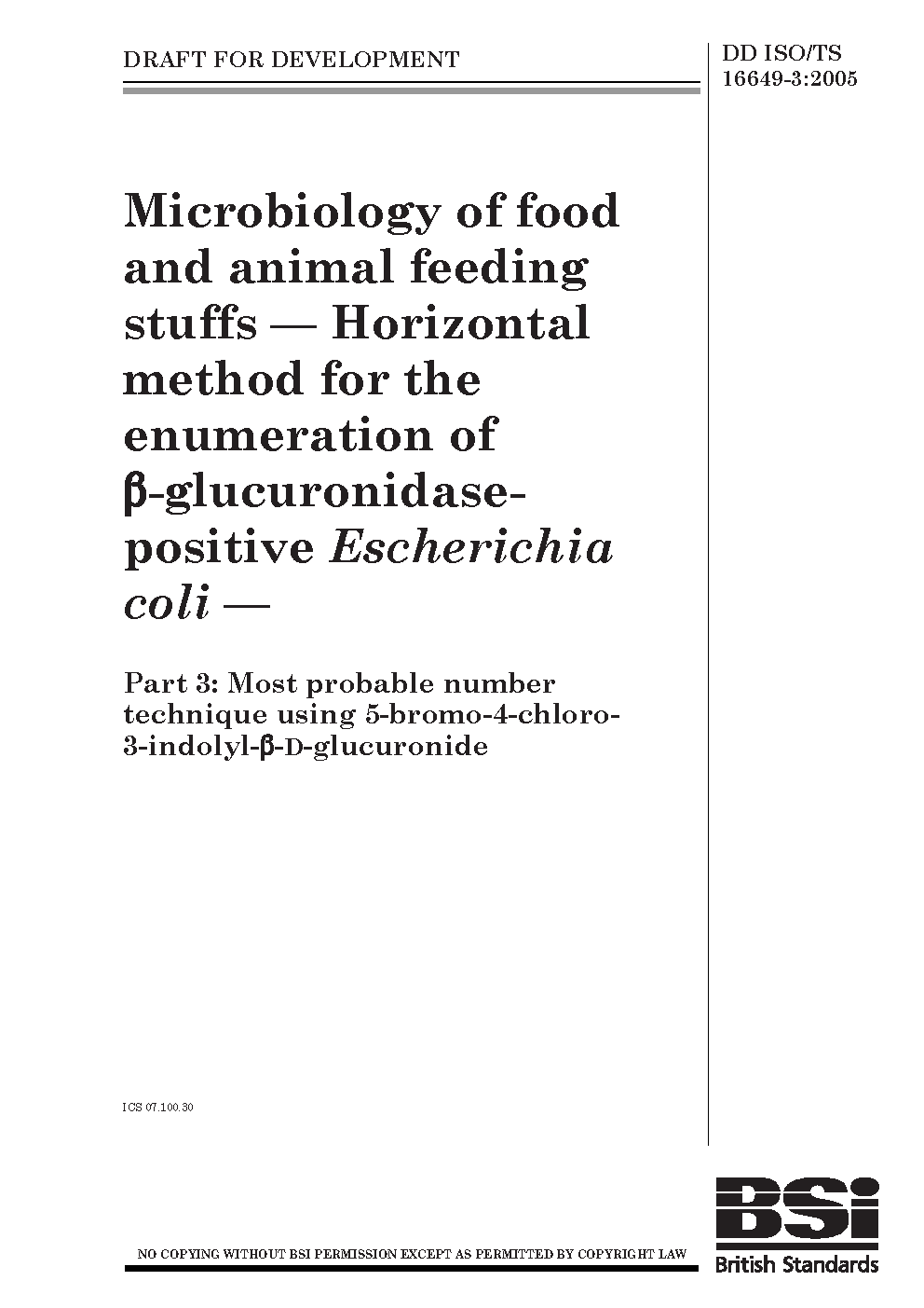 Microbiology of food and animal feeding stuffs. Horizontal method for the enumeration ß-glucuronidase positive Escherichia coli Most probable number technique using 5-bromo-4-chloro-3-indoyl-ß-D-glucuronide