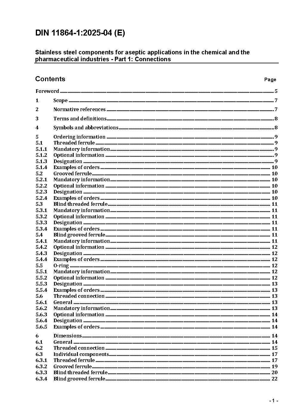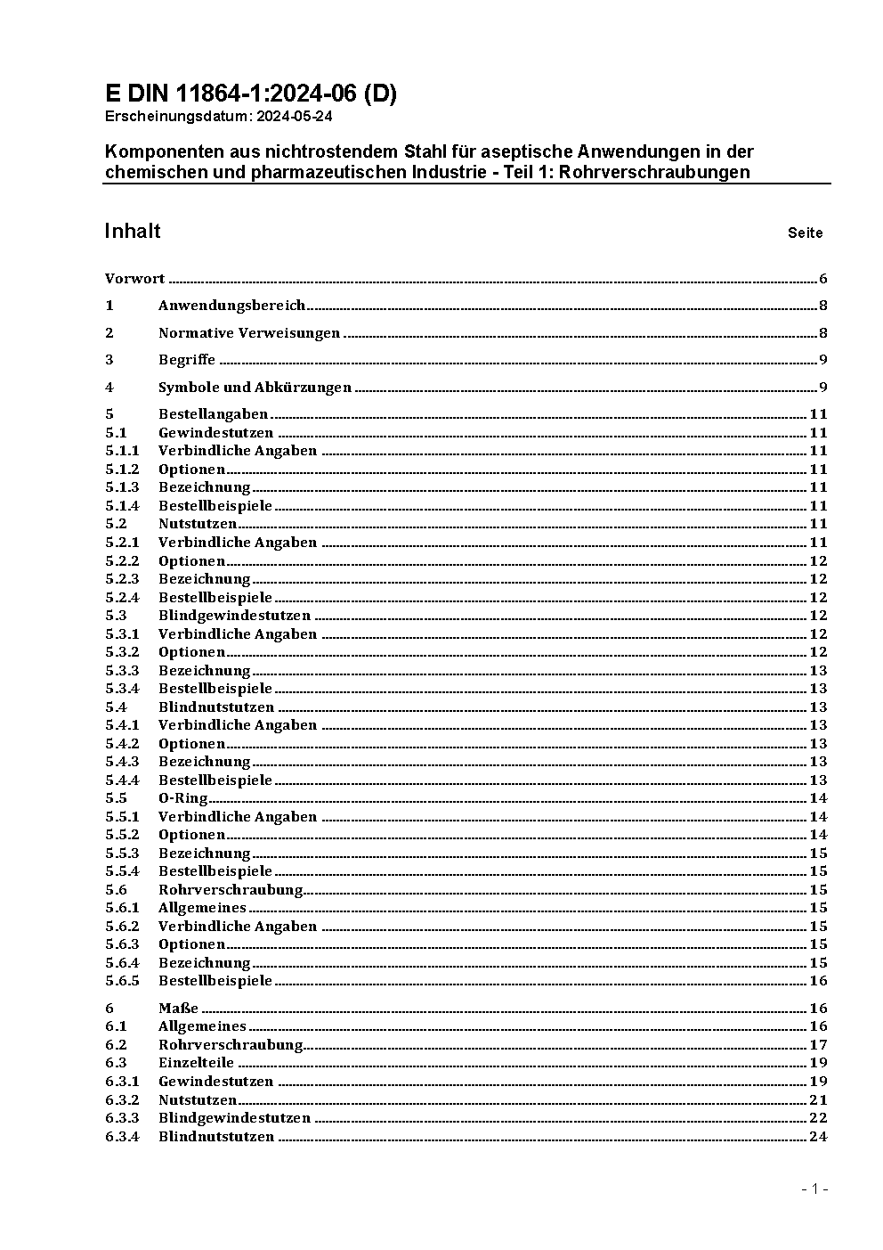 Fittings of stainless steel for the aseptic, chemical and pharmaceutical industry - Part 1: Aseptic screwed pipe connection, standard type