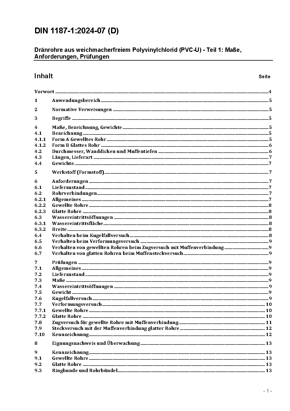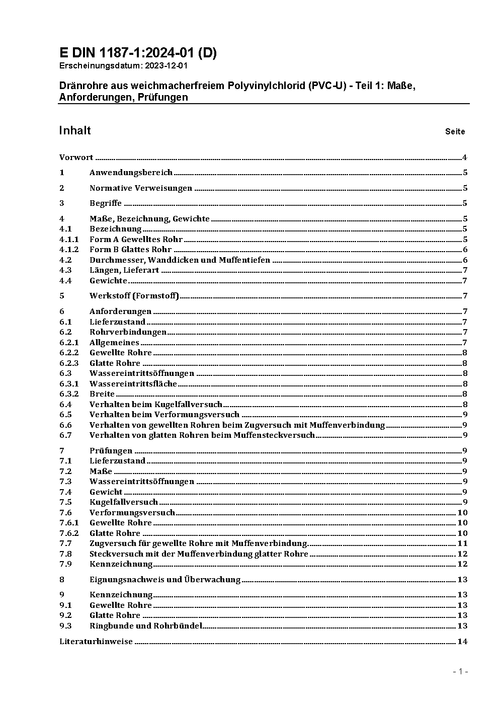 Dränrohre aus weichmacherfreiem Polyvinylchlorid (PVC-U) - Teil 1: Maße, Anforderungen, Prüfungen