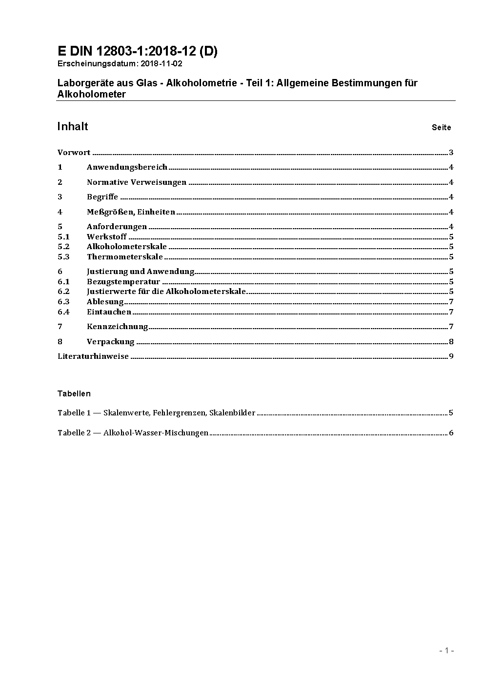 Laborgeräte aus Glas - Alkoholometrie - Teil 1: Allgemeine Bestimmungen für Alkoholometer