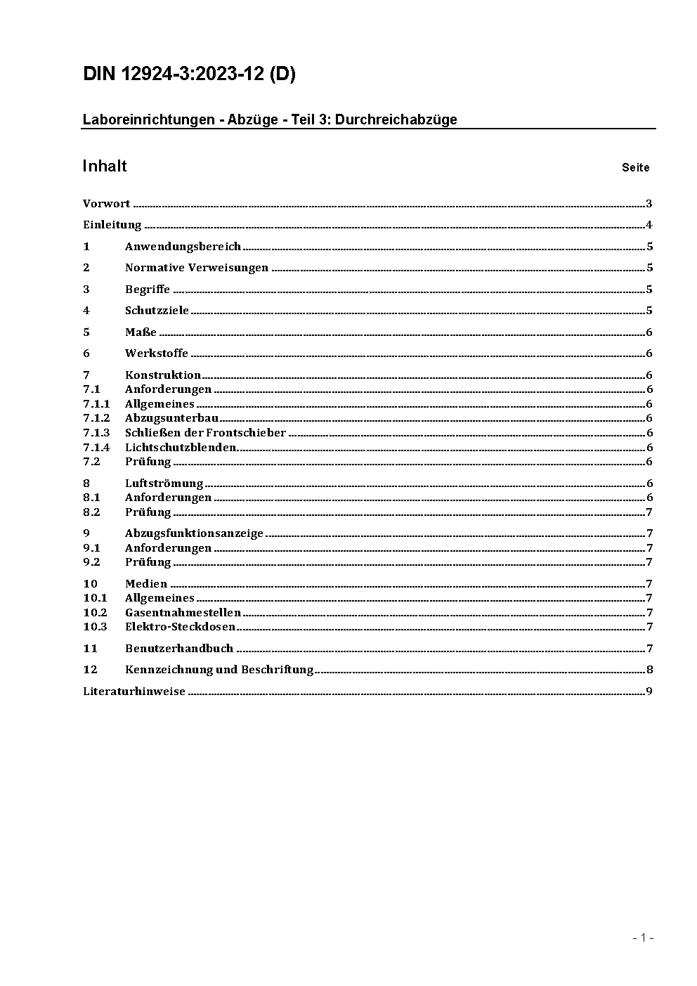 Laboreinrichtungen; Abzüge; Durchreichabzüge; Hauptmaße, Anforderungen und Prüfungen / Achtung: Übergangsfrist, festgelegt durch DIN 12924-3 (2011-01), bis 2011-06-30 beachten.