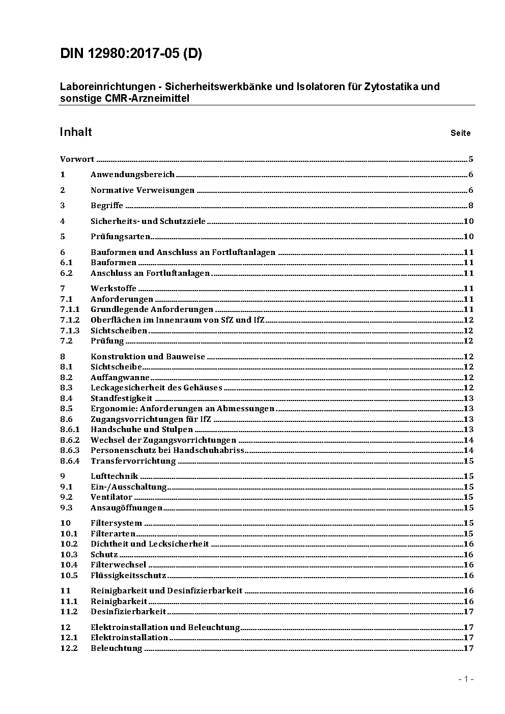 Laboreinrichtungen - Sicherheitswerkbänke für Zytostatika / Achtung: Übergangsfrist, festgelegt durch DIN 12980 (2016-10) und DIN 12980 (2017-05), bis 2017-04-01 beachten.