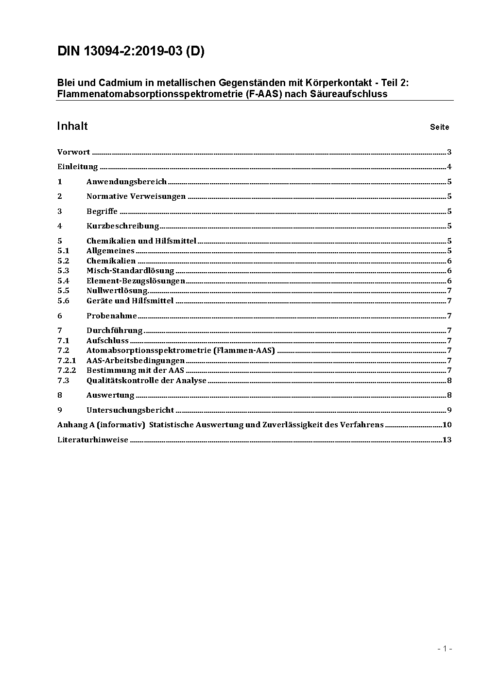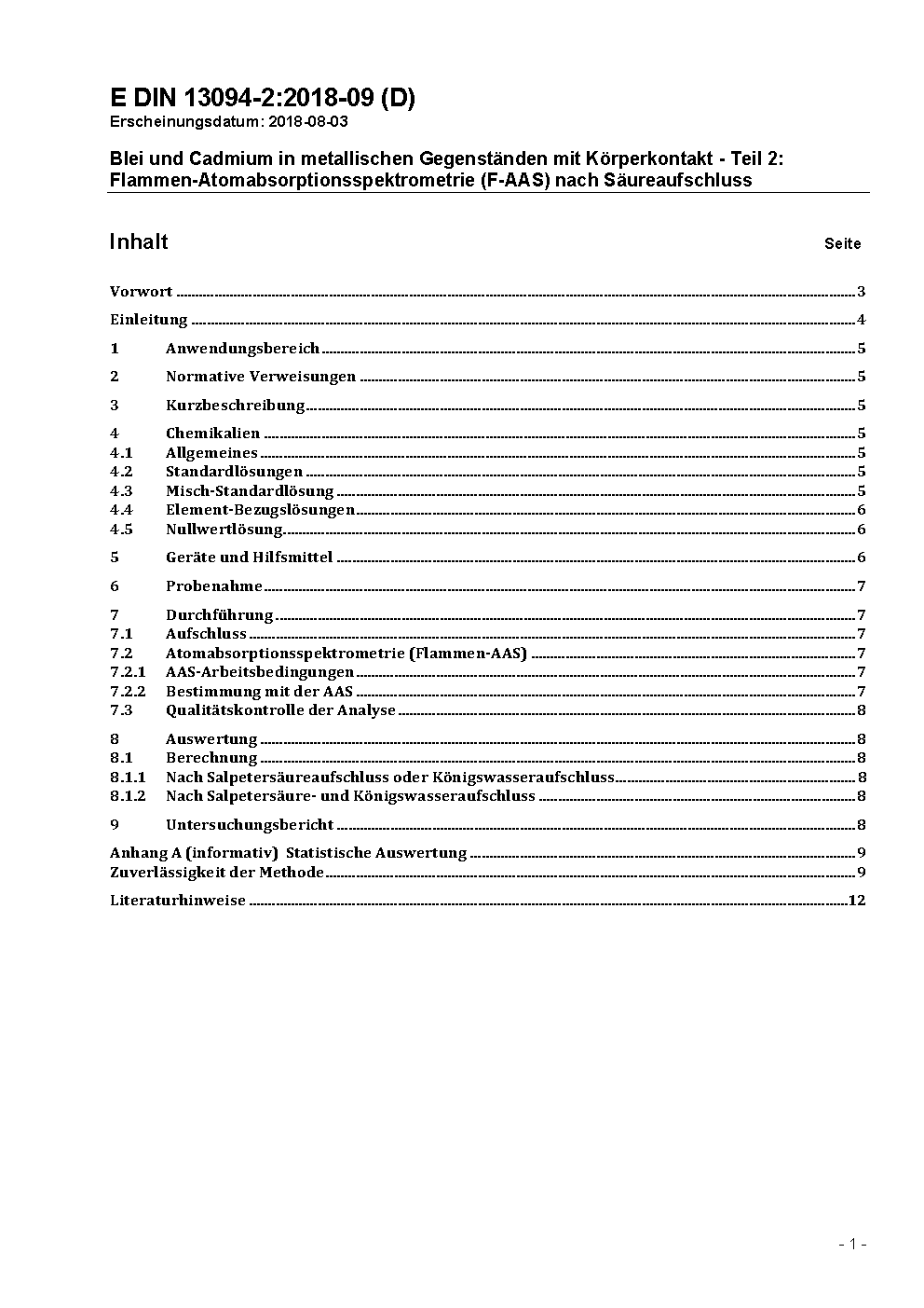 Blei und Cadmium in metallischen Gegenständen mit Körperkontakt - Teil 2: Flammen-Atomabsorptionsspektrometrie (F-AAS) nach Säureaufschluss