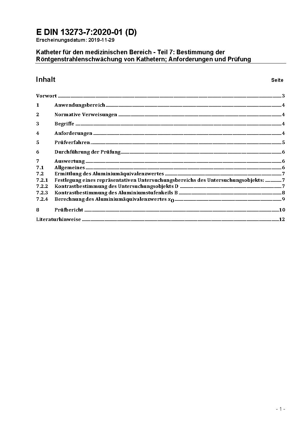 Katheter für den medizinischen Bereich - Teil 7: Bestimmung der Röntgenstrahlenschwächung von Kathetern; Anforderungen und Prüfung