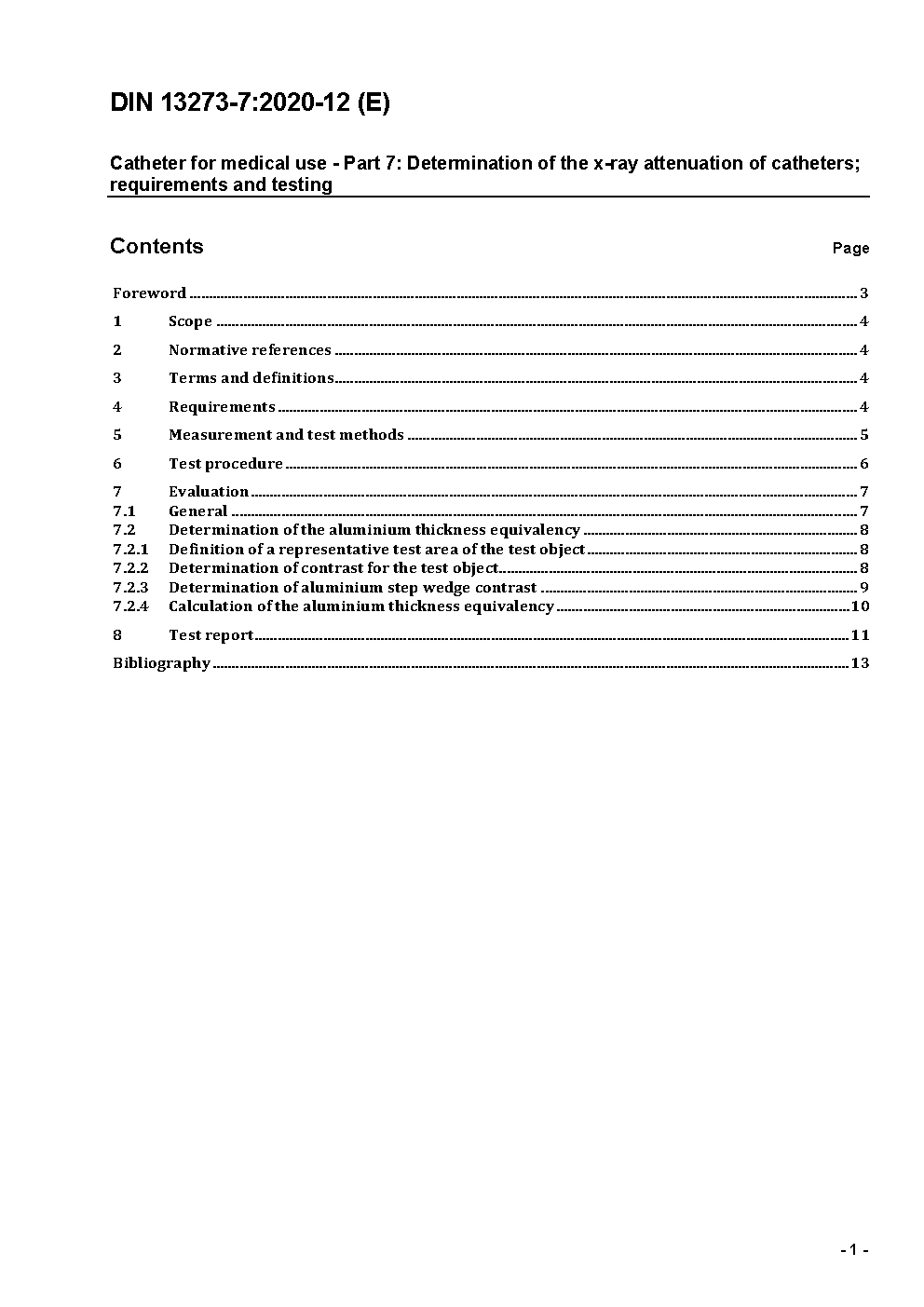 Catheters for medical use - Part 7: Determination of the x-ray attenuation of catheters; Requirements and testing