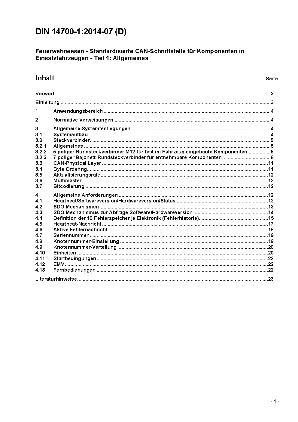 Feuerwehrwesen - Standardisierte CAN-Schnittstelle für Komponenten in Einsatzfahrzeugen - Teil 1: Allgemeines