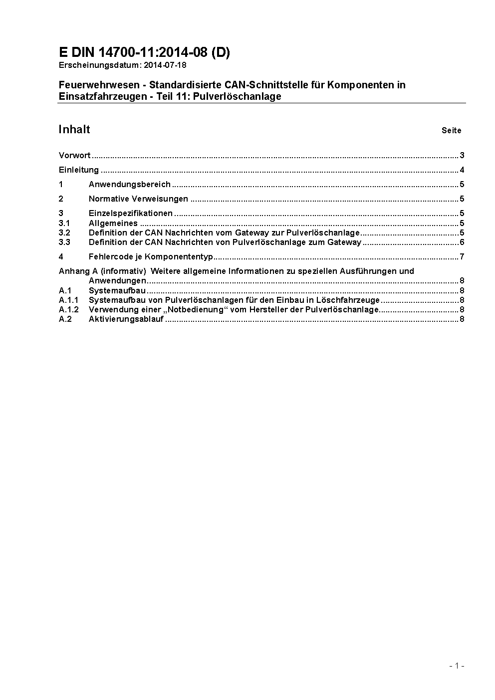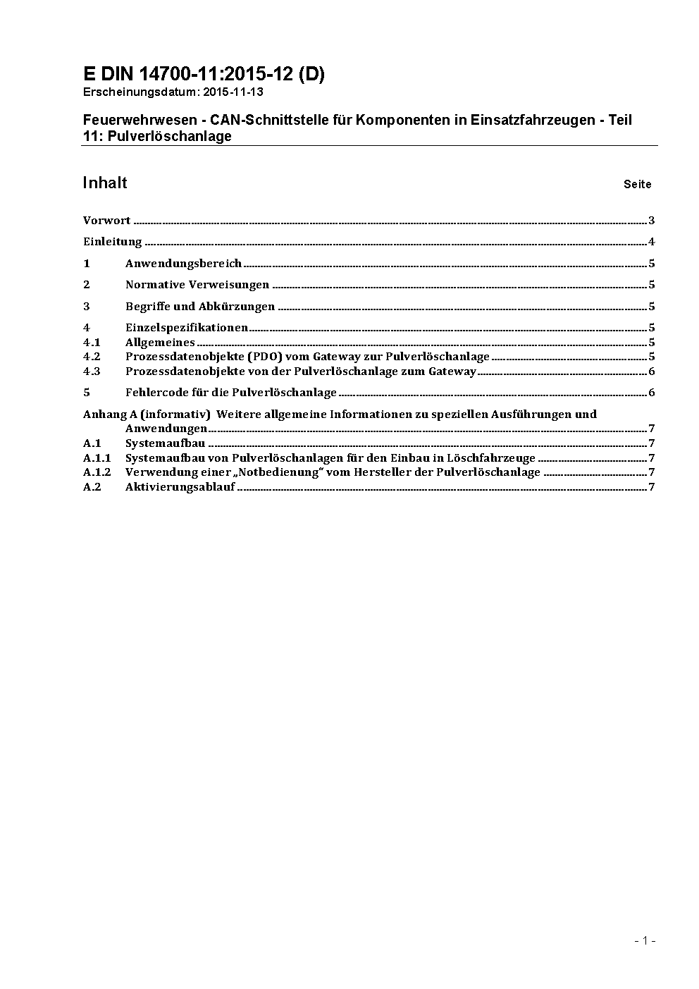 Feuerwehrwesen - Standardisierte CAN-Schnittstelle für Komponenten in Einsatzfahrzeugen - Teil 11: Pulverlöschanlage