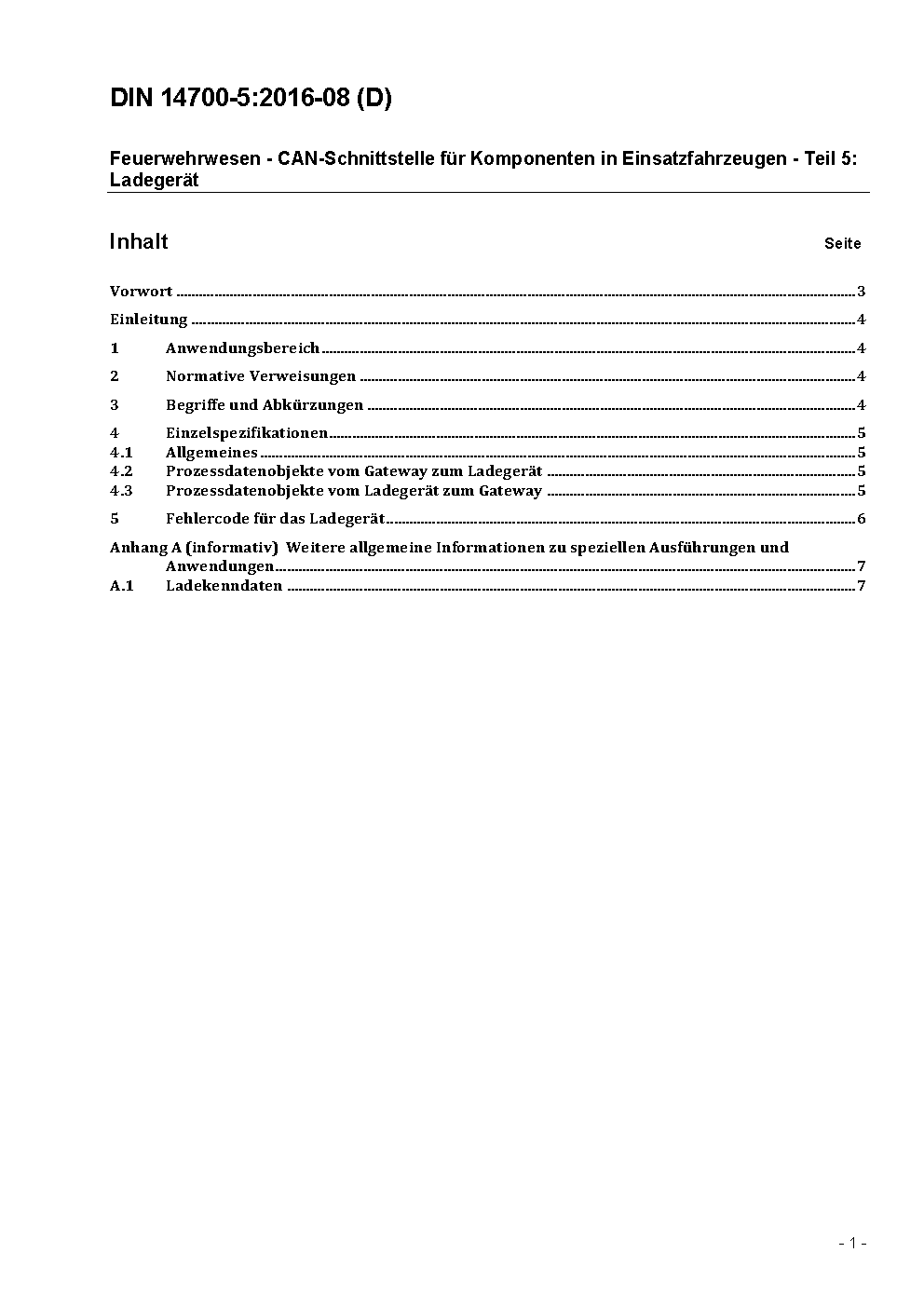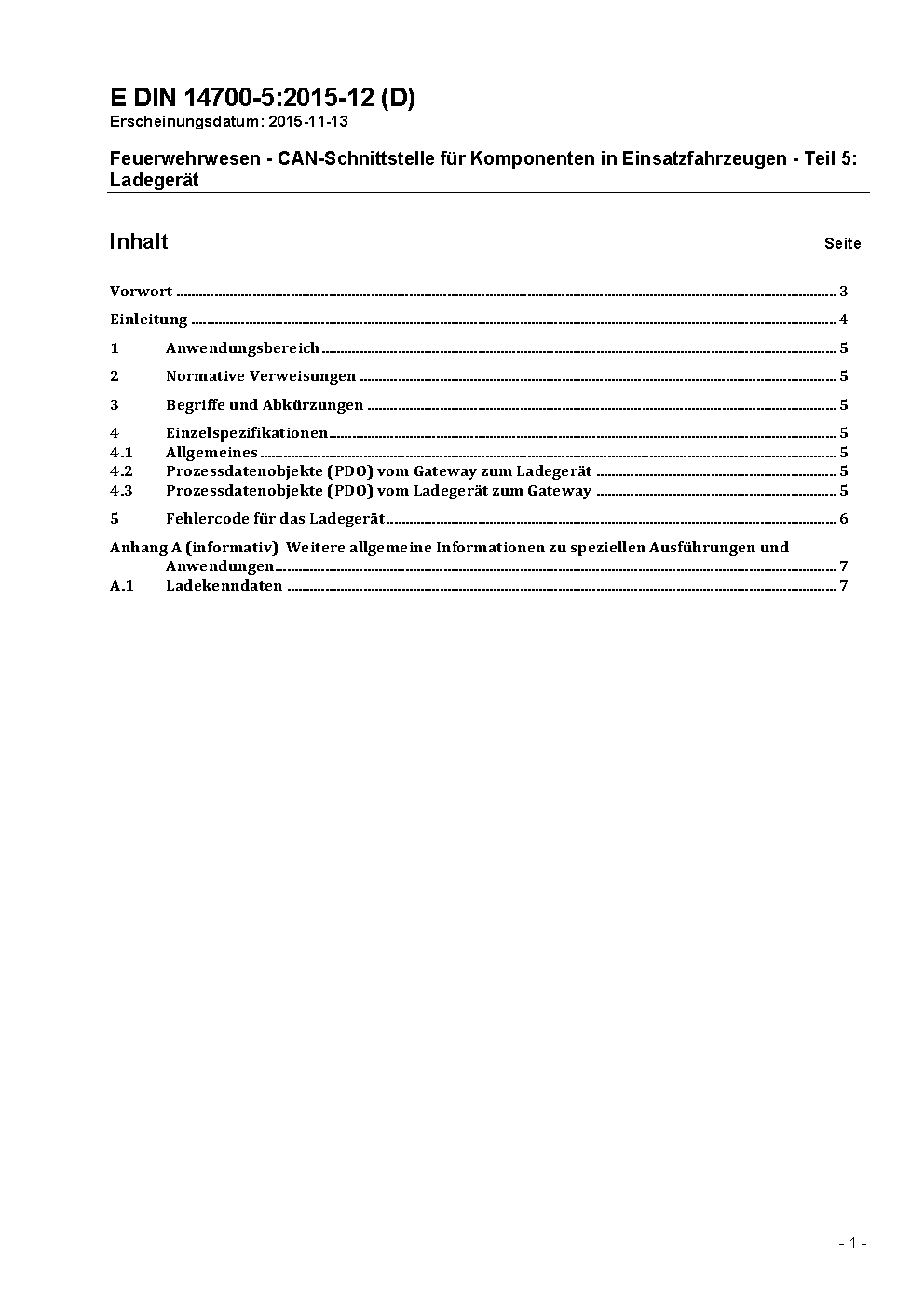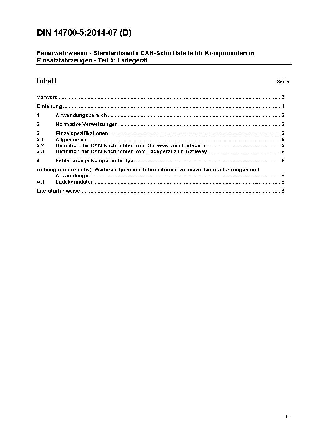 Feuerwehrwesen - Standardisierte CAN-Schnittstelle für Komponenten in Einsatzfahrzeugen - Teil 5: Ladegerät