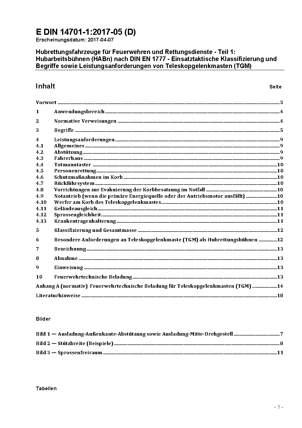 Hubrettungsfahrzeuge für Feuerwehren und Rettungsdienste - Teil 1: Hubarbeitsbühnen (HABn) nach DIN EN 1777 - Einsatztaktische Klassifizierung und Begriffe sowie Leistungsanforderungen von Teleskopgelenkmasten (TGM)