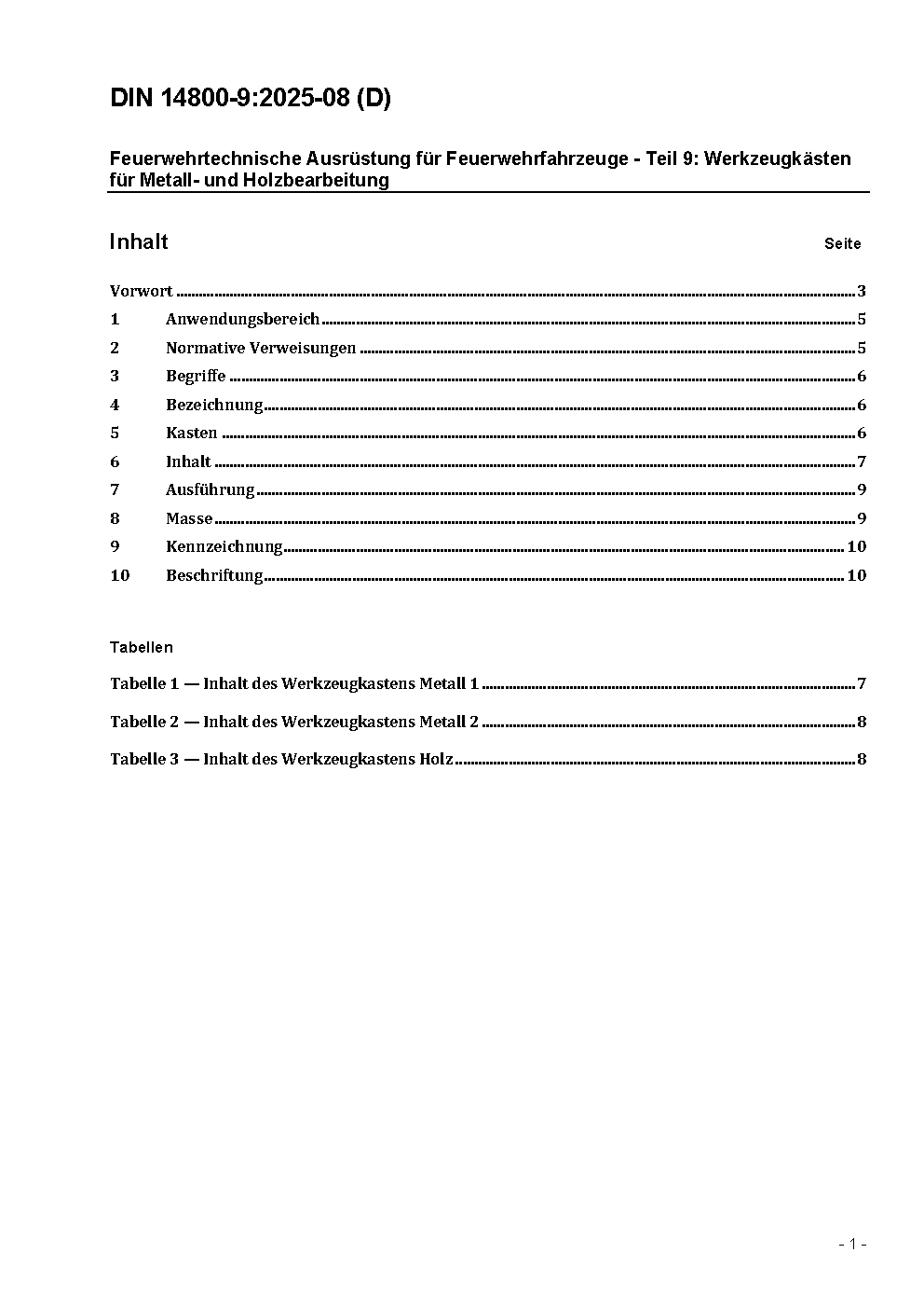 Feuerwehrtechnische Ausrüstung für Feuerwehrfahrzeuge - Teil 9: Werkzeugkästen für Metall- und Holzbearbeitung