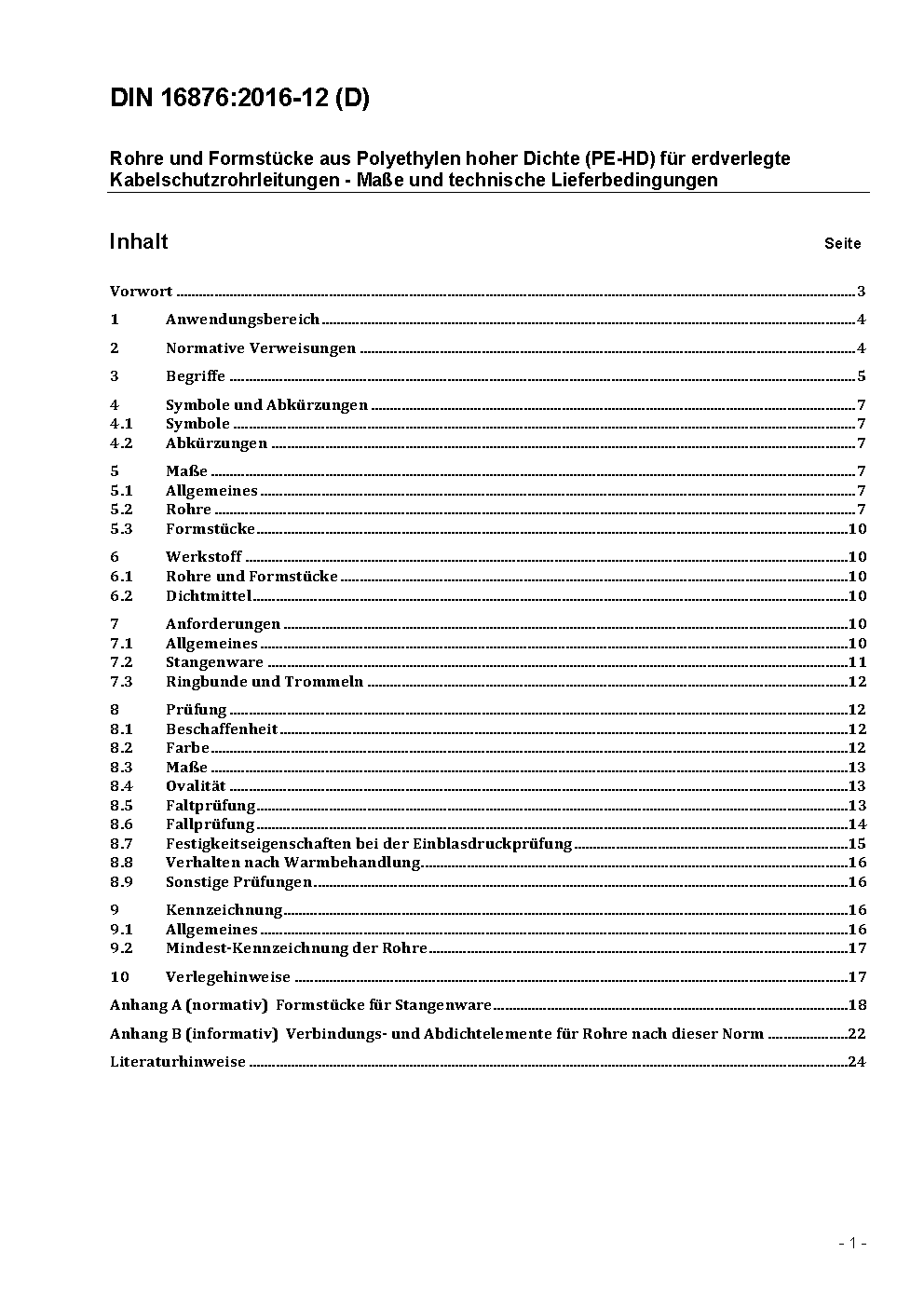 Rohre und Formstücke aus Polyethylen hoher Dichte (PE-HD) für erdverlegte Kabelschutzrohrleitungen - Maße und technische Lieferbedingungen