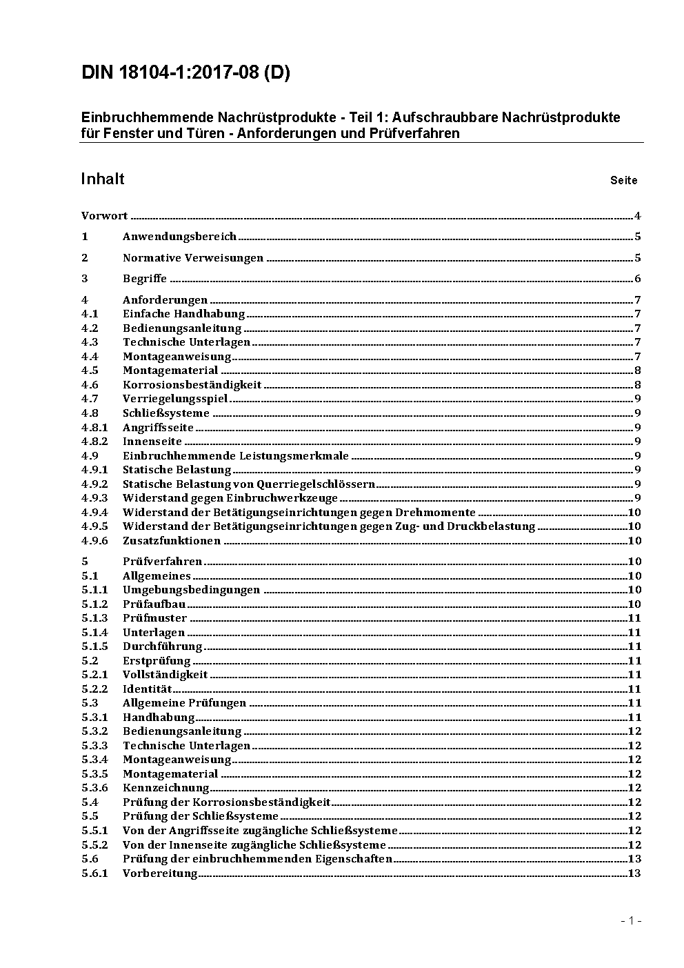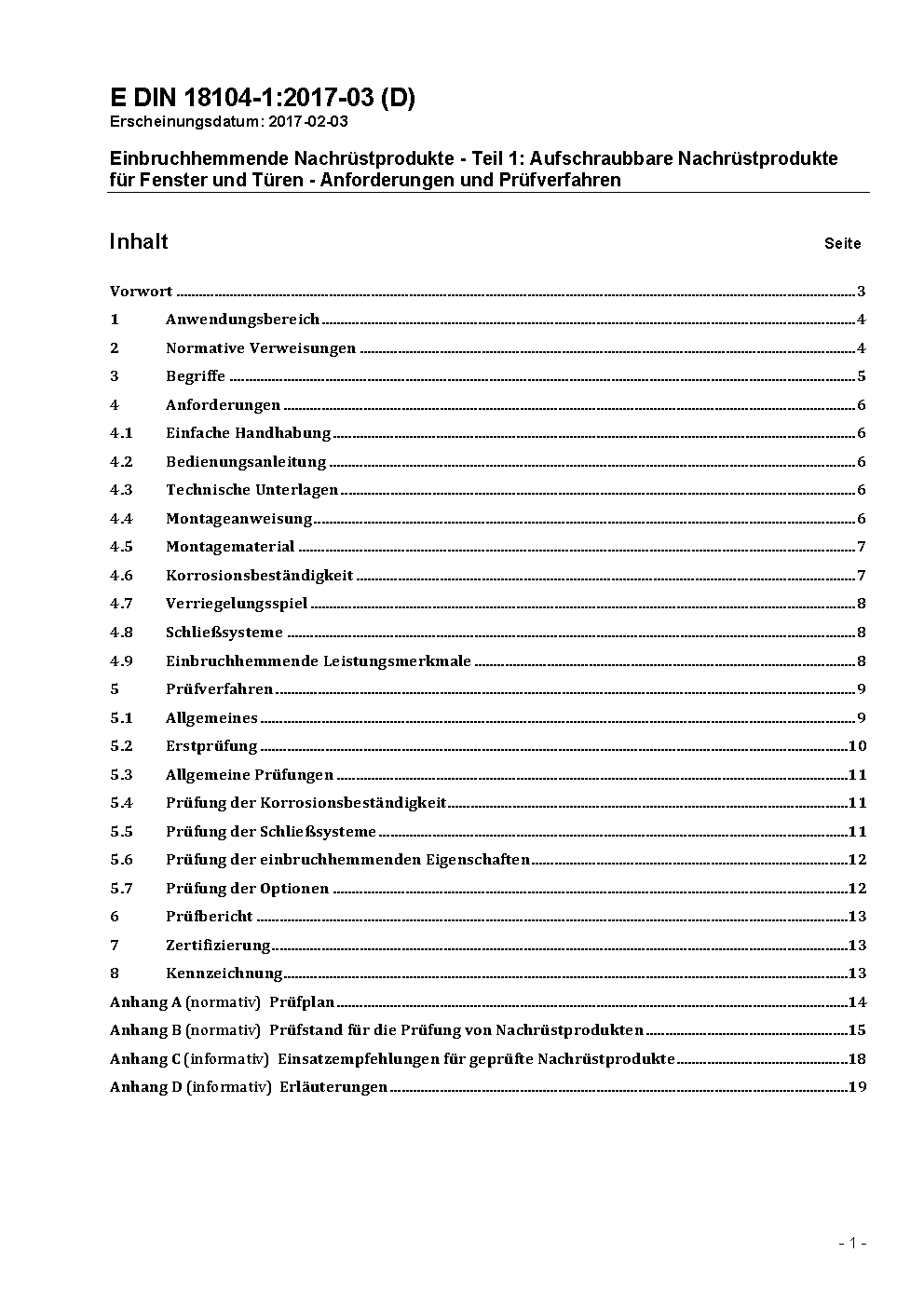 Einbruchhemmende Nachrüstprodukte - Teil 1: Aufschraubbare Nachrüstprodukte für Fenster und Türen; Anforderungen und Prüfverfahren