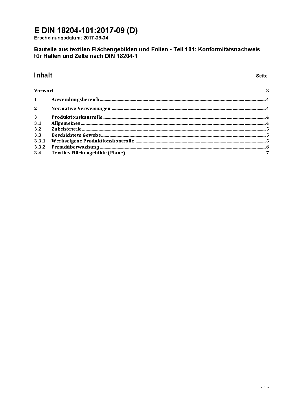 Bauteile aus textilen Flächengebilden und Folien - Teil 101: Konformitätsnachweis für Hallen und Zelte nach DIN 18204-1