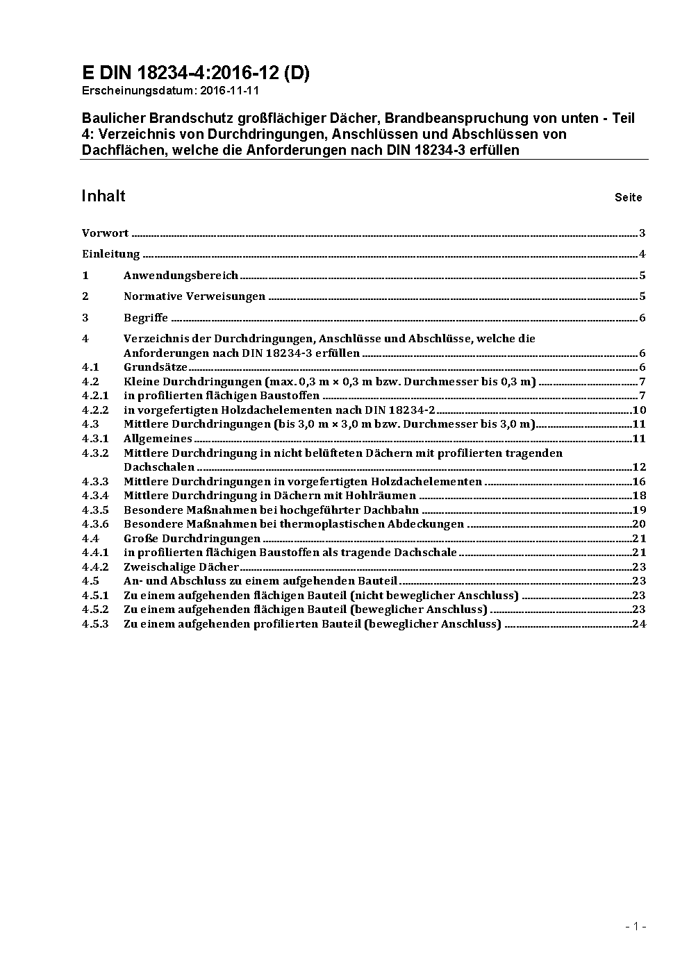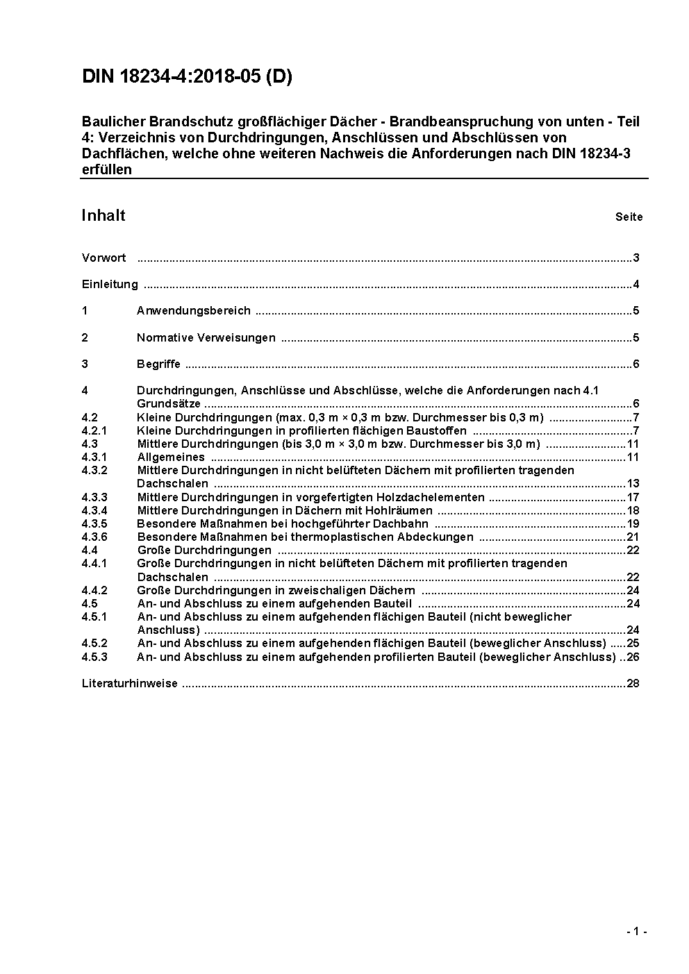 Baulicher Brandschutz großflächiger Dächer - Brandbeanspruchung von unten - Teil 4: Verzeichnis von Durchdringungen, Anschlüssen und Abschlüssen von Dachflächen, welche die Anforderungen nach DIN 18234-3 erfüllen