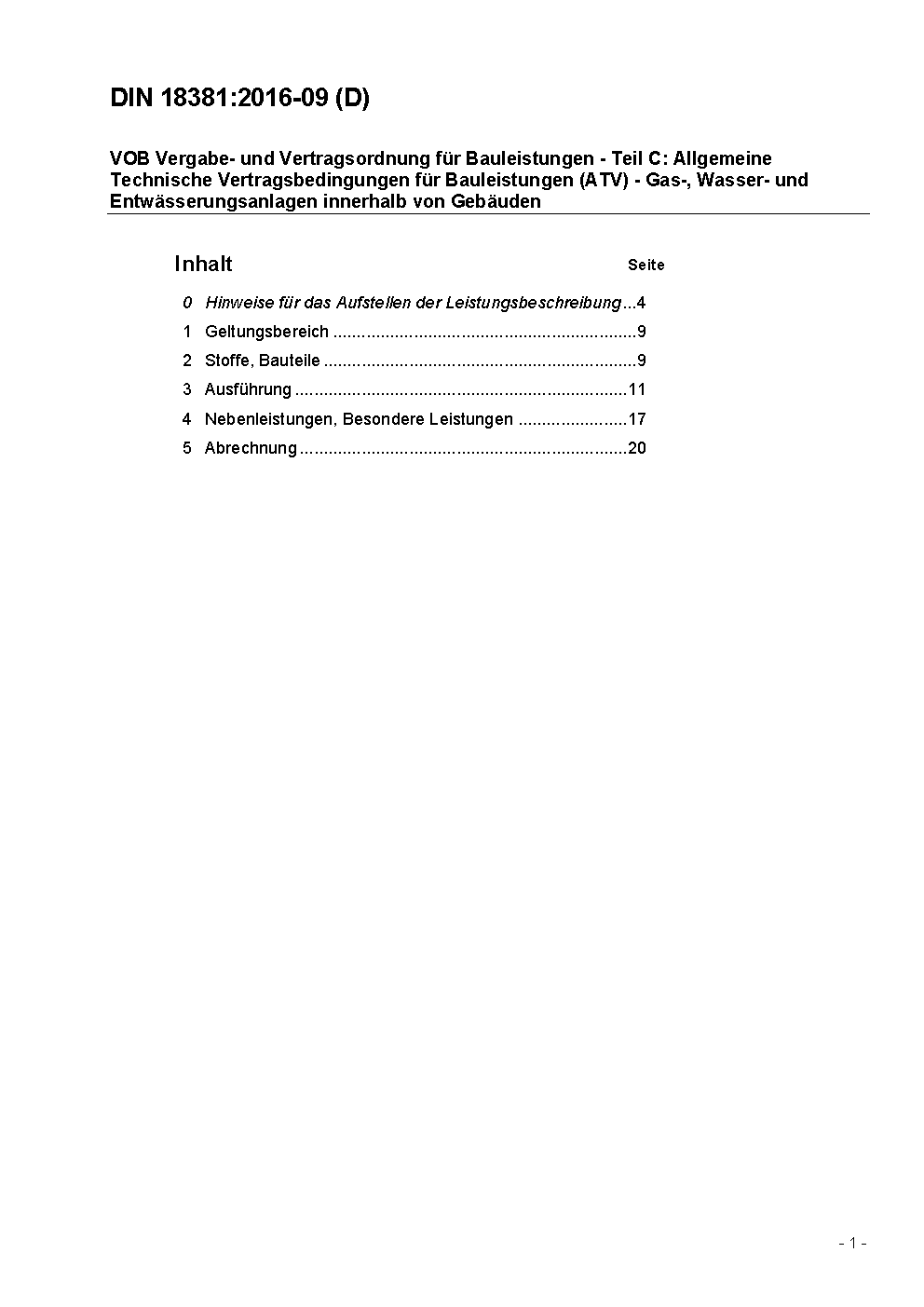 VOB Vergabe- und Vertragsordnung für Bauleistungen - Teil C: Allgemeine Technische Vertragsbedingungen für Bauleistungen (ATV) - Gas-, Wasser- und Entwässerungsanlagen innerhalb von Gebäuden
