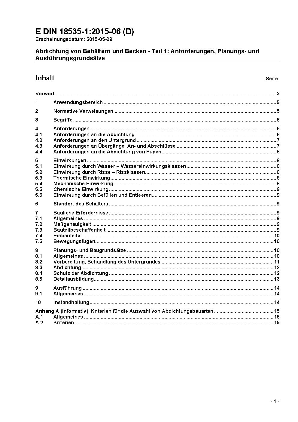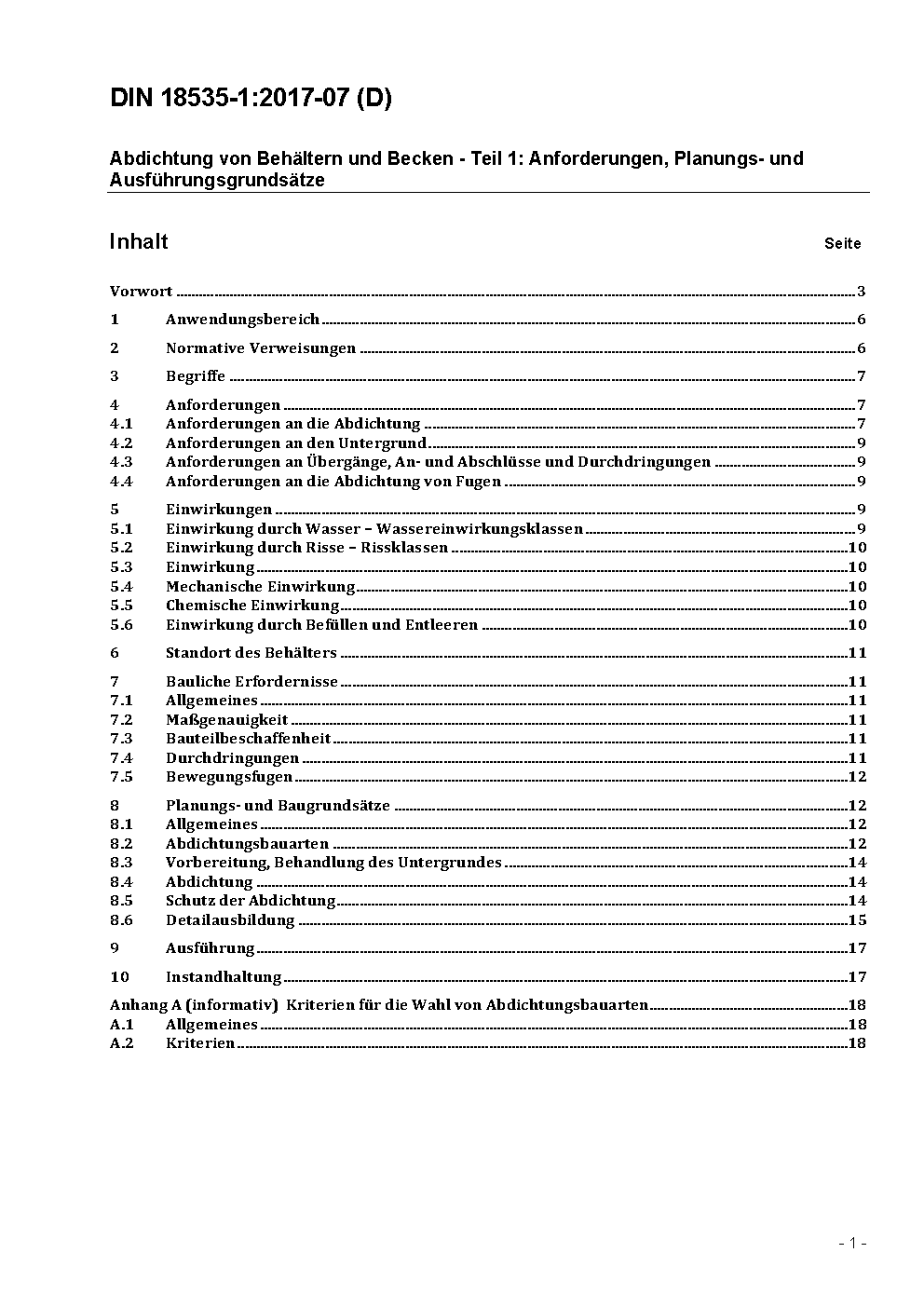 Abdichtung von Behältern und Becken - Teil 1: Anforderungen, Planungs- und Ausführungsgrundsätze / Achtung: Gilt in Verbindung mit DIN 18535-2 (2017-07), DIN 18535-3 (2017-07)