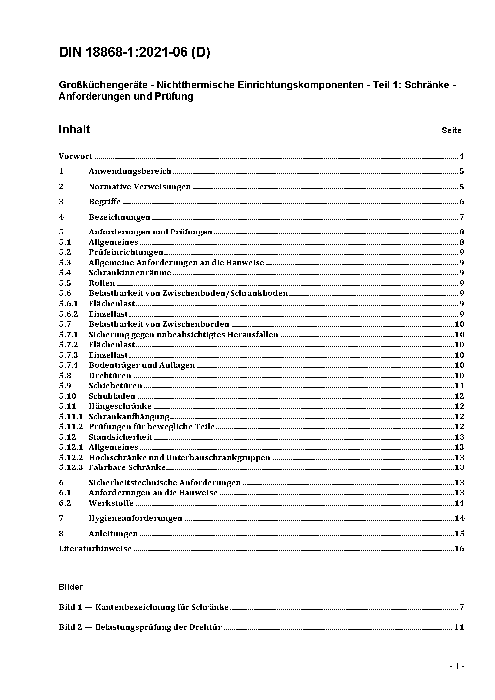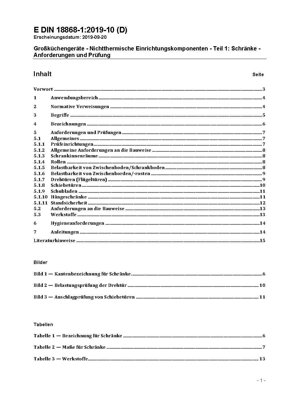 Großküchengeräte - Nichtthermische Einrichtungskomponenten - Teil 1: Schränke; Maße, Anforderungen, Prüfung